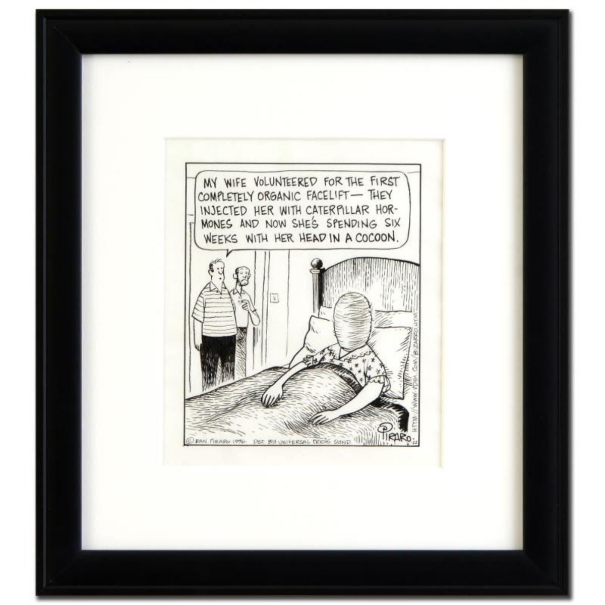 Enter a surreal and satirical world of twisted imagination and award winning creativity. "Facelift" is an original pen & ink drawing on paper by Dan Piraro, creator of the critically acclaimed and award winning comic strip, Bizarro! This piece is hand signed and comes framed. Includes Certificate of Authenticity! Measures approx. 13" x 14" (with frame), 6" x 7" (image). Reference #: 218067