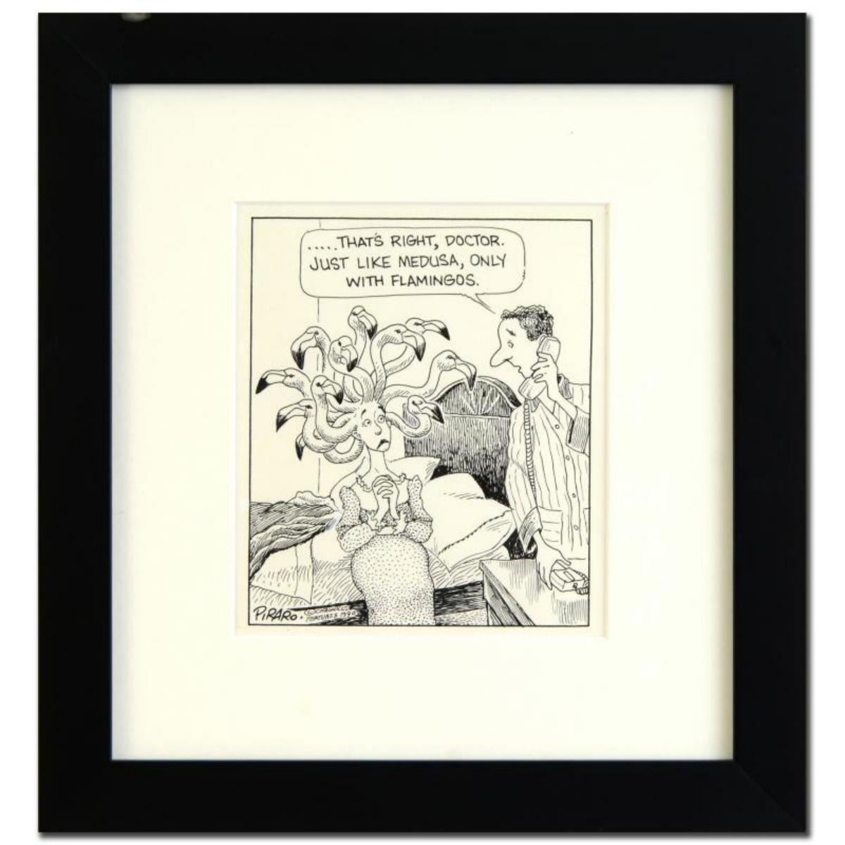 Enter a surreal and satirical world of twisted imagination and award winning creativity. "Flamingo Medusa" is an original pen & ink drawing on paper by Dan Piraro, creator of the critically acclaimed and award winning comic strip, Bizarro! This piece is hand signed and comes framed. Includes Certificate of Authenticity! Measures approx. 13" x 14" (with frame), 6" x 7" (image). ** Please note: there is a chip in the frame at the top-left corner. ** Reference #: 218039