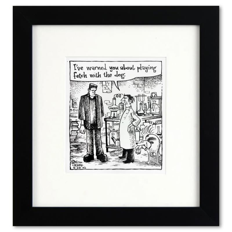 Enter a surreal and satirical world of twisted imagination and award winning creativity. "Frankenstein Fetch" is an original pen & ink drawing on paper by Dan Piraro, creator of the critically acclaimed and award winning comic strip, Bizarro. This piece is hand signed, comes custom framed and includes a letter of authenticity. Measures approximately 12" x 11" (frame), 7" x 6" (image).This item requires special handling and may have a longer than usual turnaround.