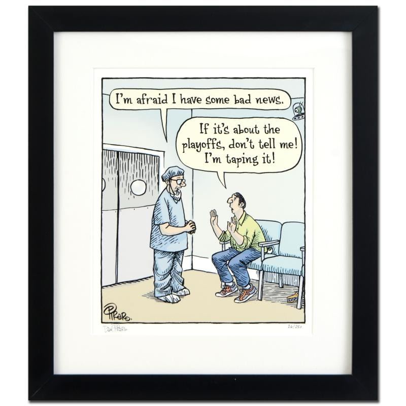 Enter a surreal and satirical world of twisted imagination and award winning creativity. "Hospital Playoffs" is a limited edition giclee on paper by Dan Piraro, creator of the critically acclaimed and award winning comic strip, Bizarro! This piece is framed, numbered and hand signed by the artist! Includes Certificate of Authenticity! Measures approx. 17" x 19" (with frame), 9.5" x 11.5" (image). PRICE INCUDES FREE SHIPPING IN THE U.S. - SHIPPING WILL BE ADDED TO YOUR INVOICE FOR ALL BUYERS OUTSIDE OF THE U.S.