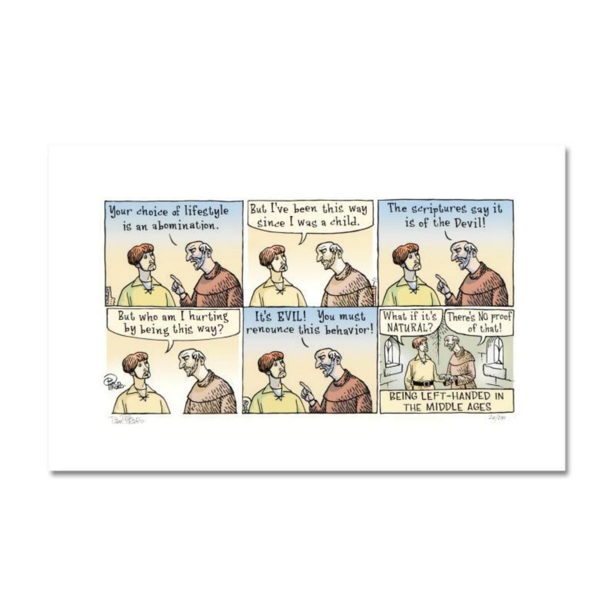 "Left Handed" is a limited edition giclee on paper by Dan Piraro, creator of the critically acclaimed and award winning comic strip, Bizarro! This piece is numbered and hand signed by the artist and includes aletterof authenticity. Measures approximtely 8" x 15" (image). Reference #: 240081.