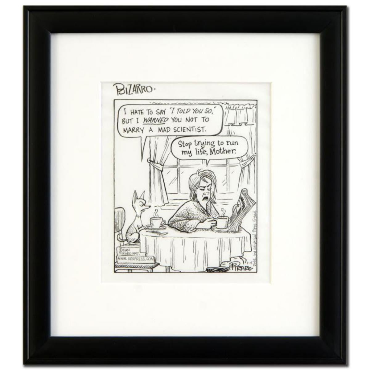 Enter a surreal and satirical world of twisted imagination and award winning creativity. "Mad Scientist" is an original pen & ink drawing on paper by Dan Piraro, creator of the critically acclaimed and award winning comic strip, Bizarro! This piece is hand signed and comes framed. Includes Certificate of Authenticity! Measures approx. 13" x 14" (with frame), 6" x 7" (image). Reference #: 218026