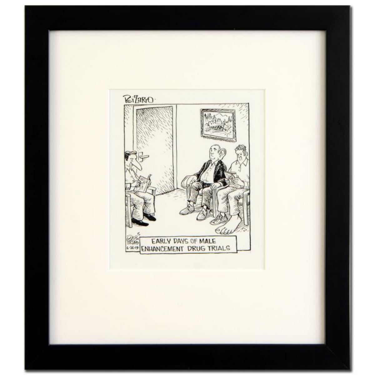 Enter a surreal and satirical world of twisted imagination and award winning creativity. "Male Enhancement" is an original pen & ink drawing on paper by Dan Piraro, creator of the critically acclaimed and award winning comic strip, Bizarro! This piece is hand signed and comes framed. Includes Certificate of Authenticity! Measures approx. 13" x 14" (with frame), 6" x 7" (image). ** Please note: there is minor wear to the corners of the frame. ** Reference #: 218089