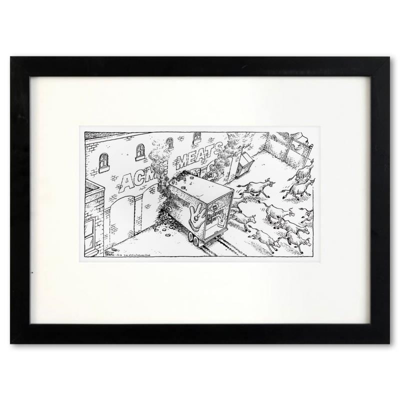 Enter a surreal and satirical world of twisted imagination and award winning creativity. "Meat Factory" is an original pen & ink drawing on paper by Dan Piraro, creator of the critically acclaimed and award winning comic strip, Bizarro. This piece is hand signed, comes custom framed and includes a letter of authenticity. Measures approximately 14" x 21" (frame), 7" x 13" (image).This item requires special handling and may have a longer than usual turnaround.