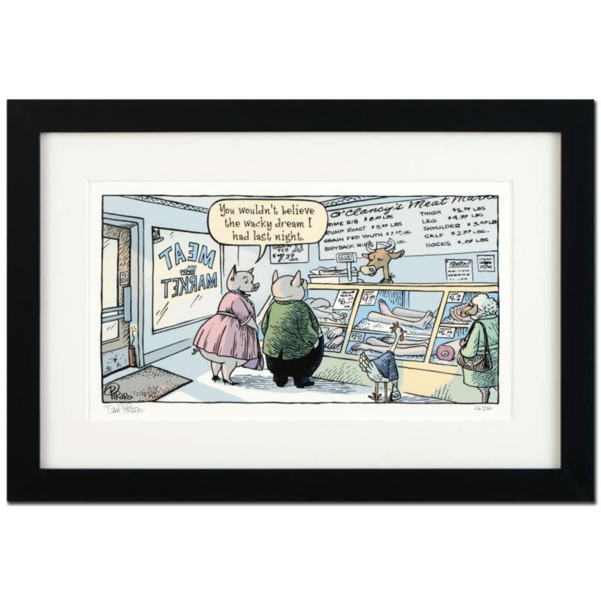 Enter a surreal and satirical world of twisted imagination and award winning creativity. "Meat Market" is a limited edition giclee on paper by Dan Piraro, creator of the critically acclaimed and award winning comic strip, Bizarro! This piece is framed, numbered and hand signed by the artist! Includes Certificate of Authenticity! Measures approx. 22" x 15" (with frame), 15" x 8" (image). Reference #: 214167.