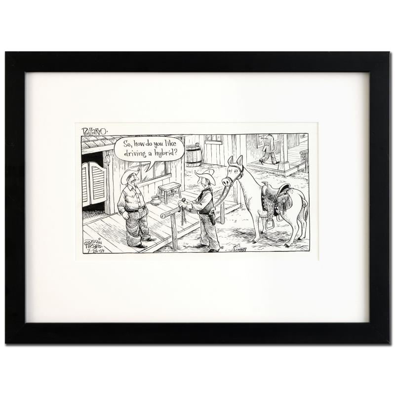Enter a surreal and satirical world of twisted imagination and award winning creativity. "Old West Hybrid" is an original pen & ink drawing on paper by Dan Piraro, creator of the critically acclaimed and award winning comic strip, Bizarro! This piece is hand signed and comes framed. Includes Certificate of Authenticity! Measures approx. 22.5" x 16.5" (with frame), 13" x 7" (image). ** Please note: there is minor wear to the corners of the frame. **