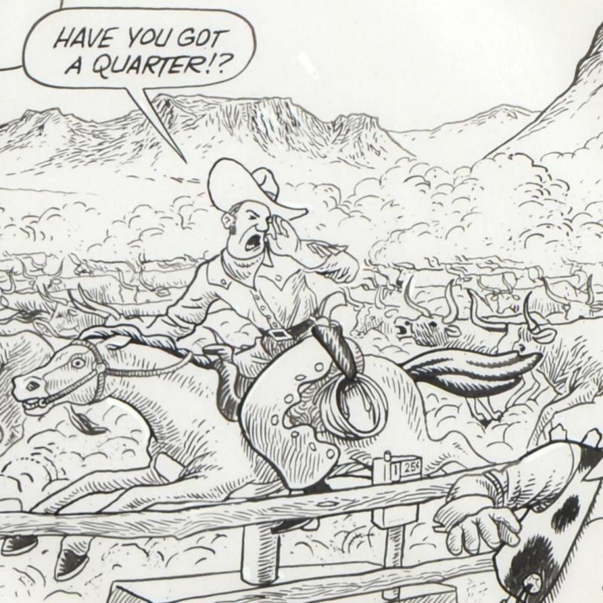 Enter a surreal and satirical world of twisted imagination and award winning creativity. "Old West Stampede" is an original pen & ink drawing on paper by Dan Piraro, creator of the critically acclaimed and award winning comic strip, Bizarro! This piece is hand signed and comes framed. Includes Certificate of Authenticity! Measures approx. 21.5" x 15" (with frame), 13" x 7" (image). Reference #: 218042
