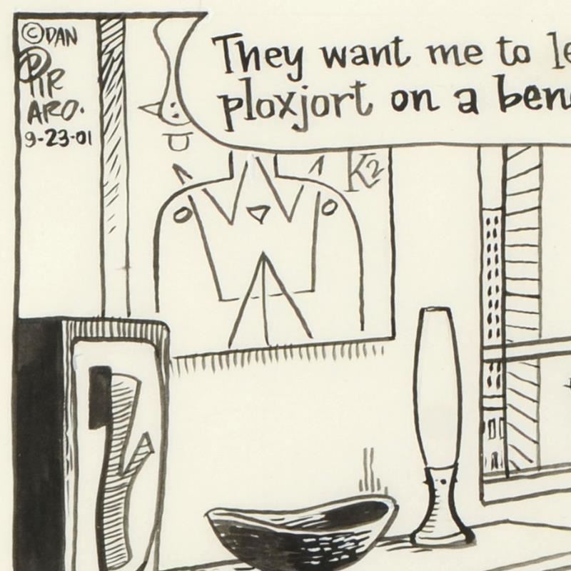 Enter a surreal and satirical world of twisted imagination and award winning creativity. "Alien Abduction" is an original pen & ink drawing on paper by Dan Piraro, creator of the critically acclaimed and award winning comic strip, Bizarro. This piece is hand signed and comes framed. Includes Letter of Authenticity! Measures approx. 20.5" x 14.5" (frame), 13" x 7" (image).