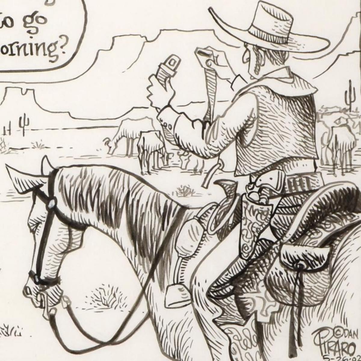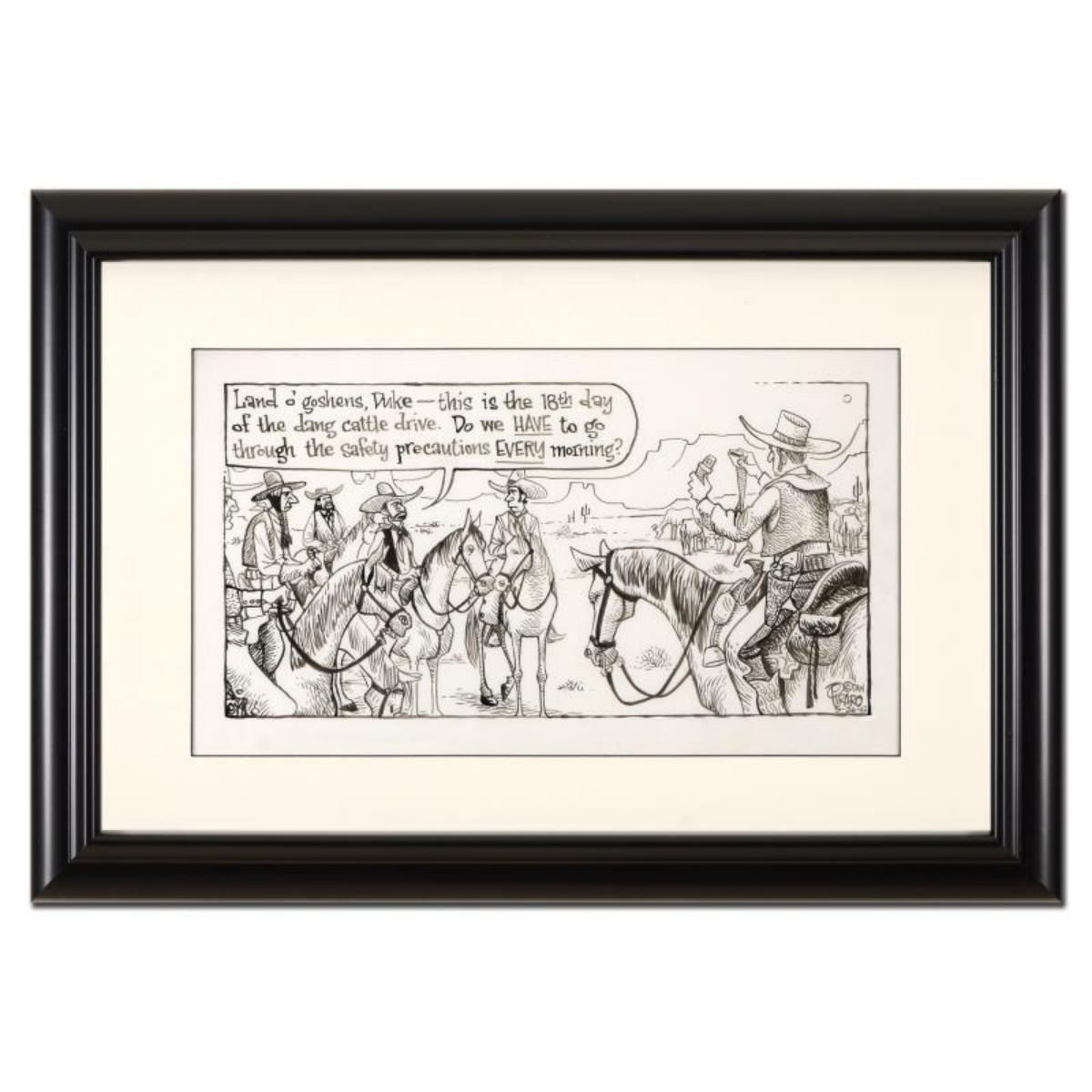 Enter a surreal and satirical world of twisted imagination and award winning creativity. "Safety in the Old West" is an original pen & ink drawing on paper by Dan Piraro, creator of the critically acclaimed and award winning comic strip, Bizarro. This piece is hand signed and comes framed. Includes Letter of Authenticity! Measures approx. 20.5" x 14.5" (frame), 13" x 7" (image). Reference #: 243598