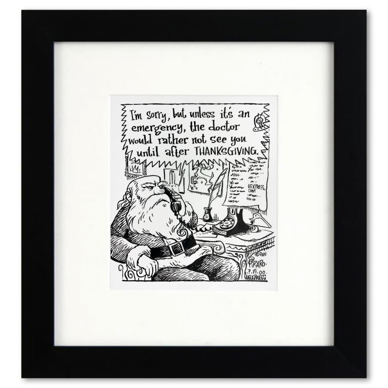 Enter a surreal and satirical world of twisted imagination and award winning creativity. "Santa Doctor" is an original pen & ink drawing on paper by Dan Piraro, creator of the critically acclaimed and award winning comic strip, Bizarro. This piece is hand signed, comes custom framed and includes a letter of authenticity. Measures approximately 12" x 11" (frame), 6.5" x 6" (image).This item requires special handling and may have a longer than usual turnaround.