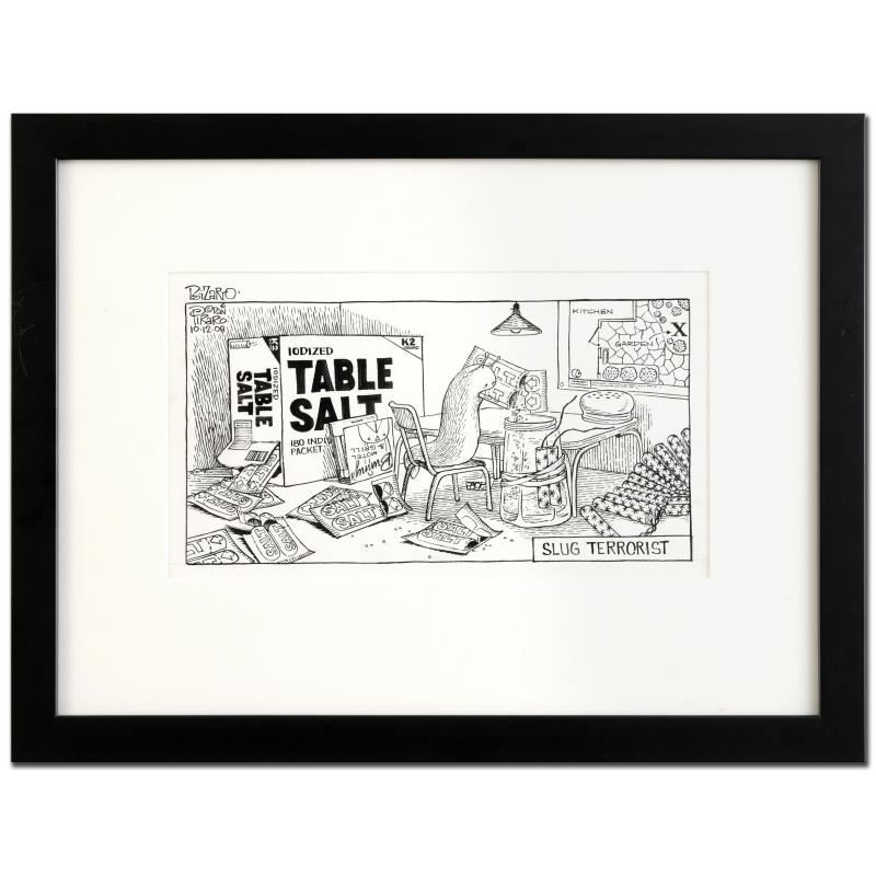 Enter a surreal and satirical world of twisted imagination and award winning creativity. "Slug Terrorist" is an original pen & ink drawing on paper by Dan Piraro, creator of the critically acclaimed and award winning comic strip, Bizarro! This piece is ha