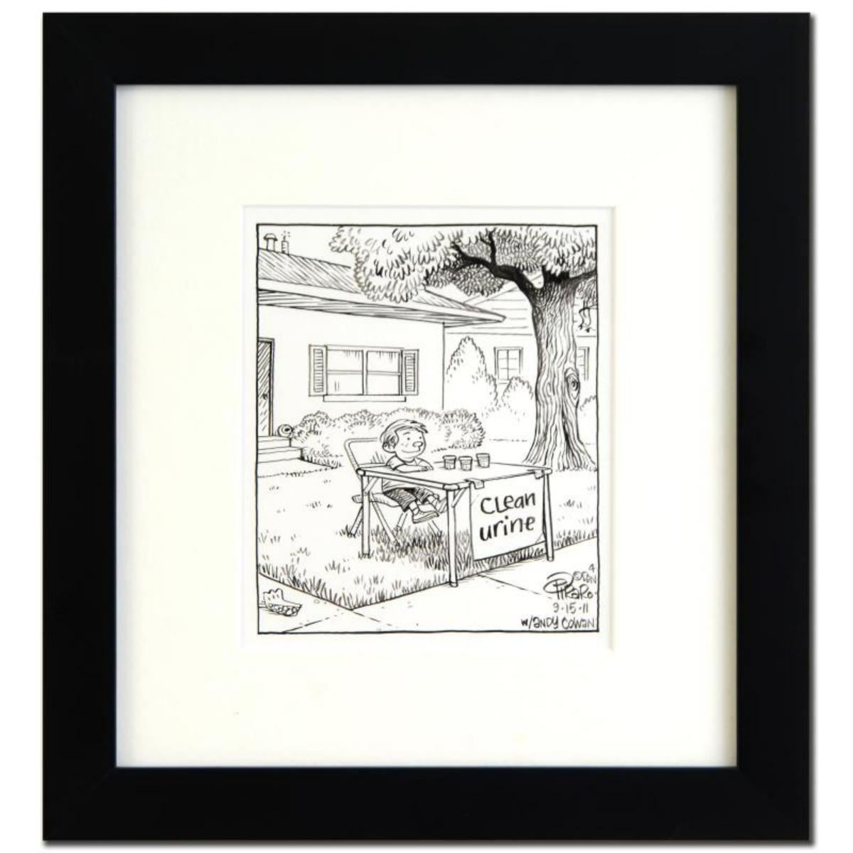 Enter a surreal and satirical world of twisted imagination and award winning creativity. "The Stand" is an original pen & ink drawing on paper by Dan Piraro, creator of the critically acclaimed and award winning comic strip, Bizarro! This piece is hand signed and comes framed. Includes Certificate of Authenticity! Measures approx. 13" x 14" (with frame), 6" x 7" (image). Reference #: 218070