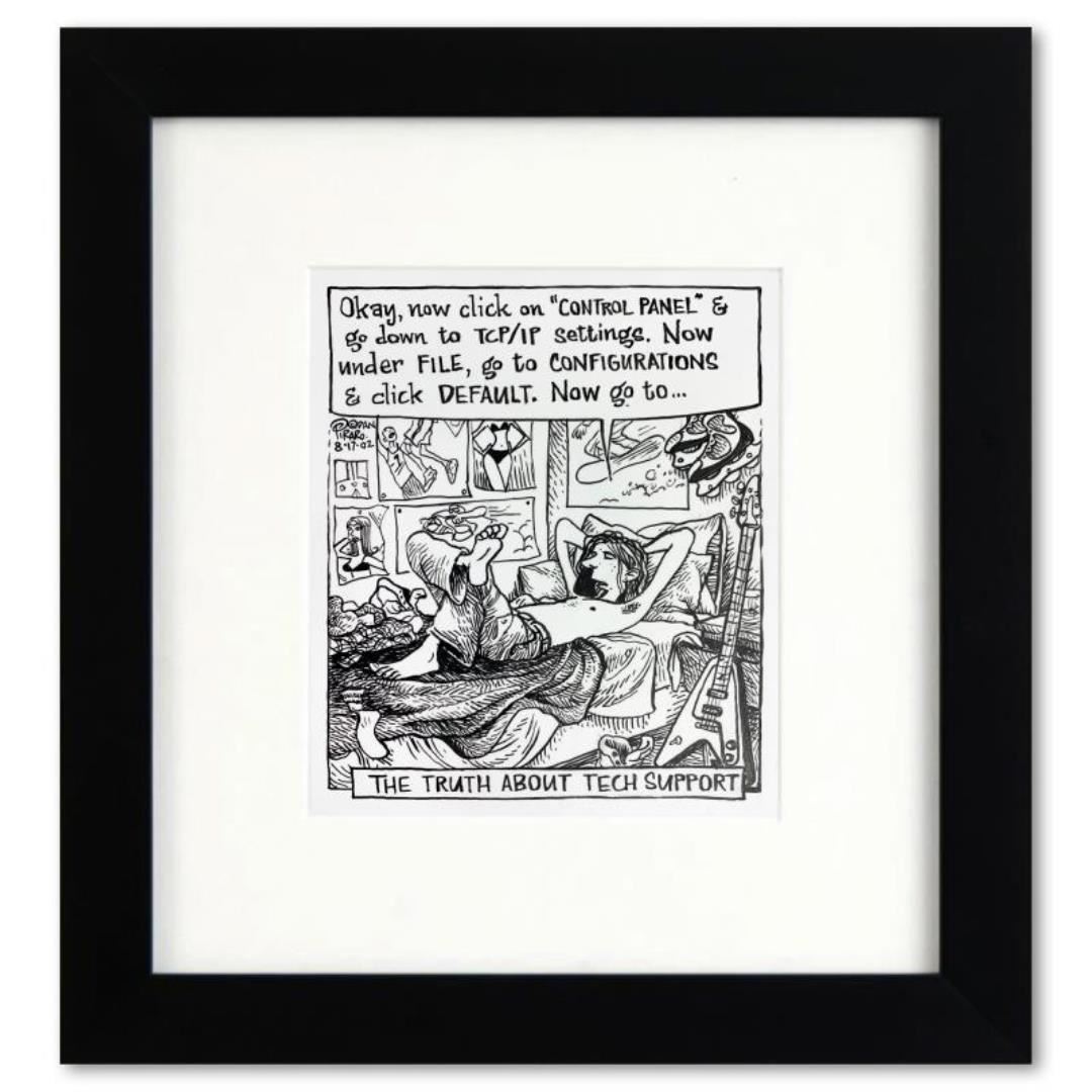 Enter a surreal and satirical world of twisted imagination and award winning creativity. "Truth About Tech Support" is an original pen & ink drawing on paper by Dan Piraro, creator of the critically acclaimed and award winning comic strip, Bizarro. This piece is hand signed, comes custom framed and includes a letter of authenticity. Measures approximately 12" x 11" (frame), 7" x 6" (image).This item requires special handling and may have a longer than usual turnaround.