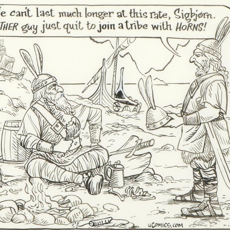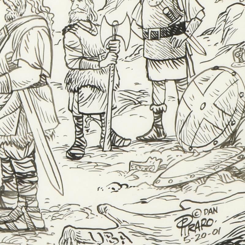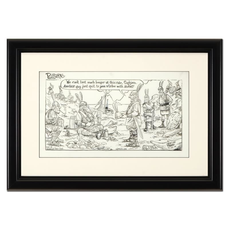 Enter a surreal and satirical world of twisted imagination and award winning creativity. "Viking Defection" is an original pen & ink drawing on paper by Dan Piraro, creator of the critically acclaimed and award winning comic strip, Bizarro. This piece is hand signed and comes framed. Includes Letter of Authenticity! Measures approx. 20.5" x 14.5" (frame), 13" x 7" (image).