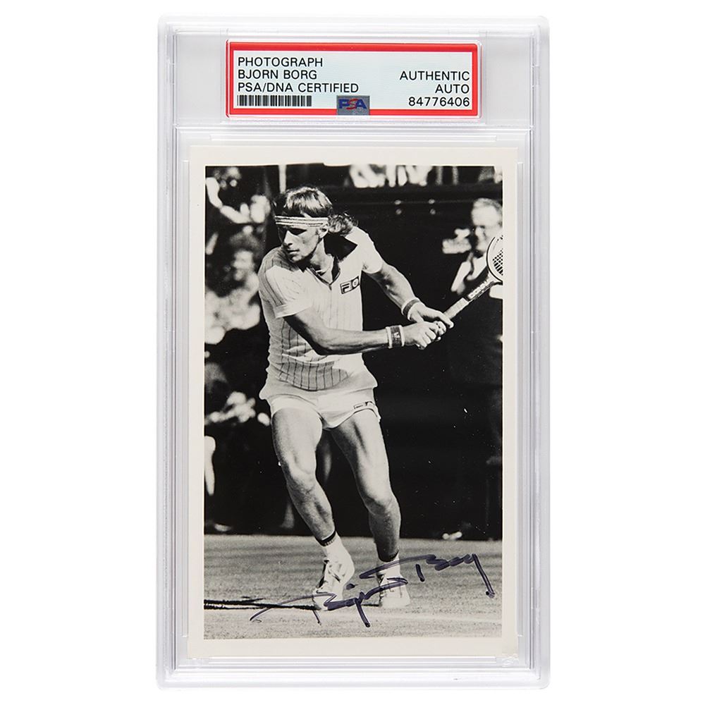Glossy 3.5 x 5.5 full-length photo of Bjorn Borg, signed in black felt tip by the tennis superstar. In fine condition. Encapsulated in a PSA/DNA authentication holder.