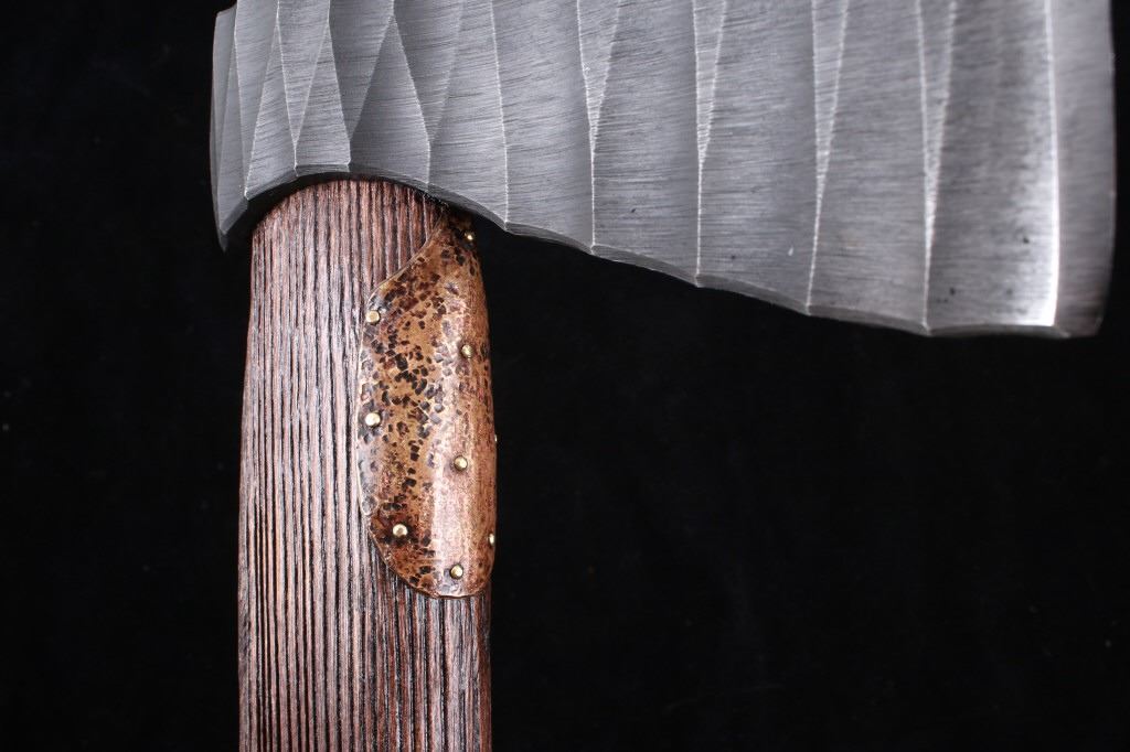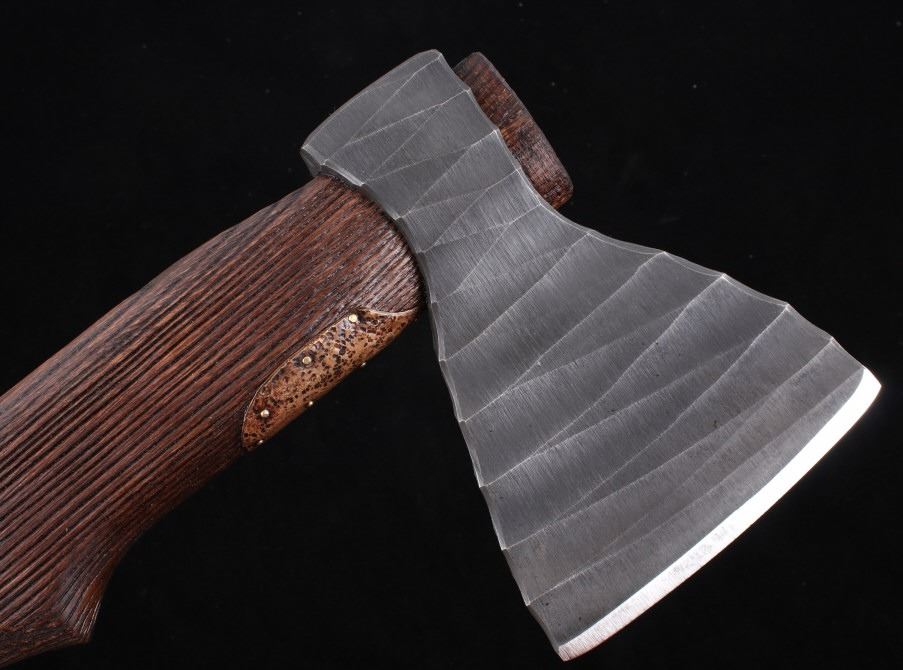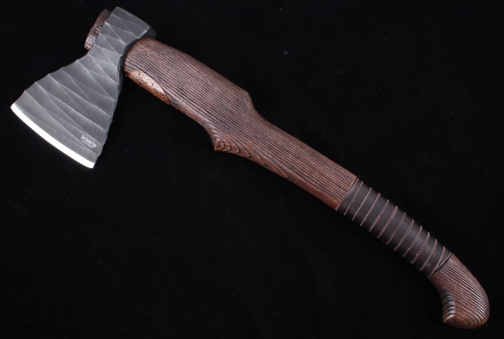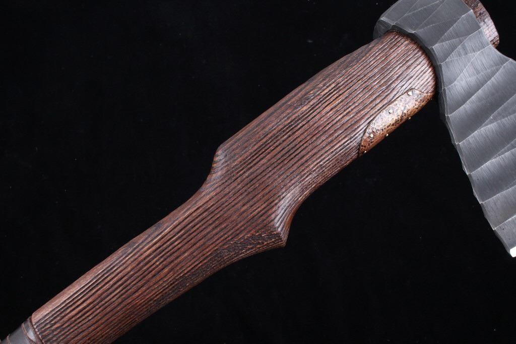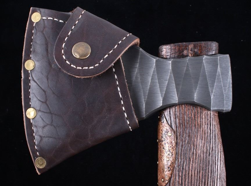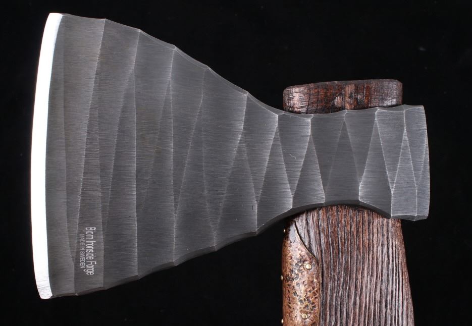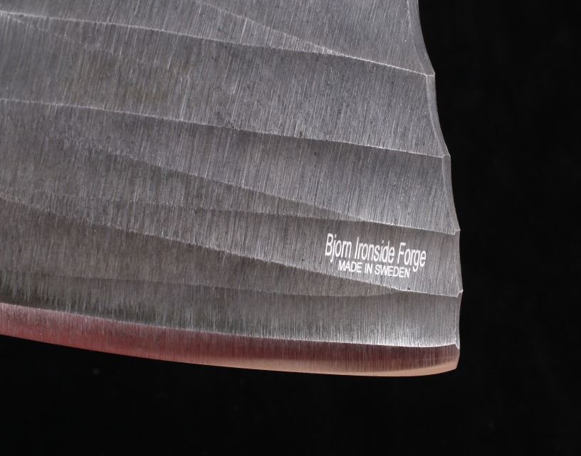 Featured in this lot is a forged high carbon Viking style battle axe made by Bjorn Ironside Forge located in Sweden. The forge is named after Bjorn Ironside, a Norse Viking chief and King of Sweden during the 9th century. King Bjorn Ironside was the son of legendary Viking king Ragnar Lothbrok and appears in Norse legends. This Viking style hand axe displays a wide axe head with machined grooves across the sides. The head is constructed from G10600 carbon steel and 52100 ball bearing steel. The left side of the blade is marked "Bjorn Ironside Forge Made In Sweden". The oak haft of the axe features a dark brown exterior with a decorative copper plate in the front. The piece shows a slightly curved handle with a leather wrapped grip. The axe displays wonderful condition and an excellent design. The piece comes with a custom leather cover. The axe measures 20 3/4" long overall, with the head measuring 6 1/2" long with a 4 3/4" cutting edge.