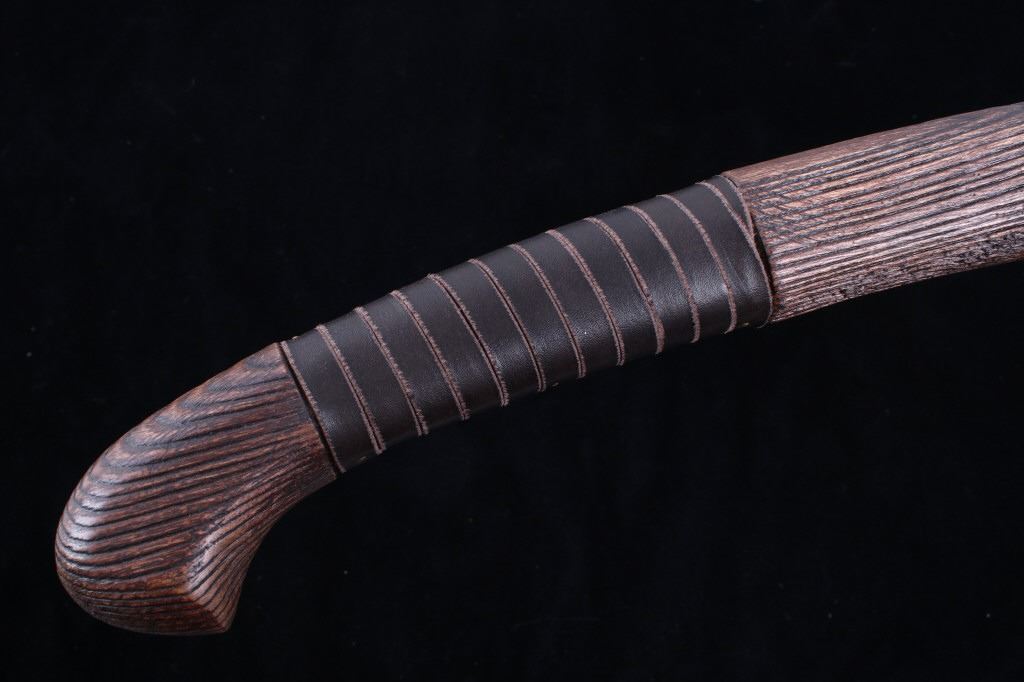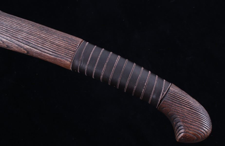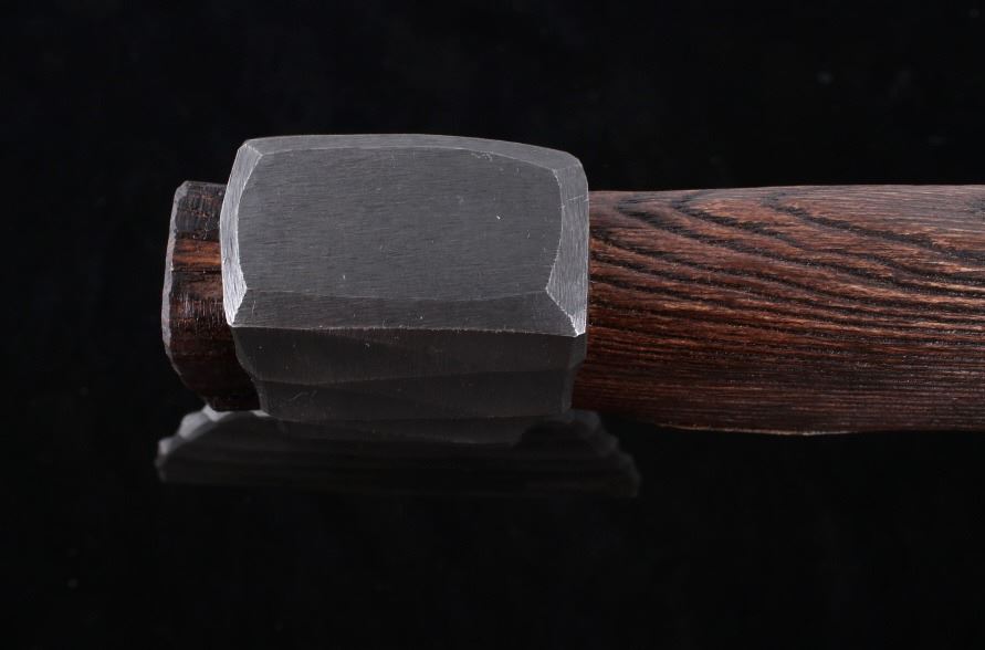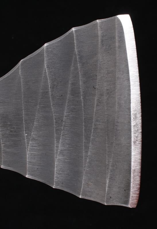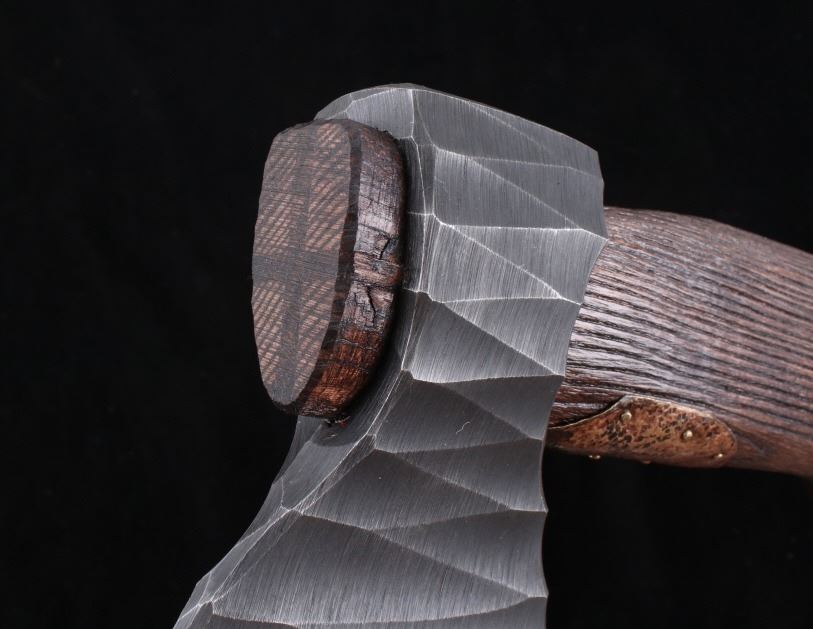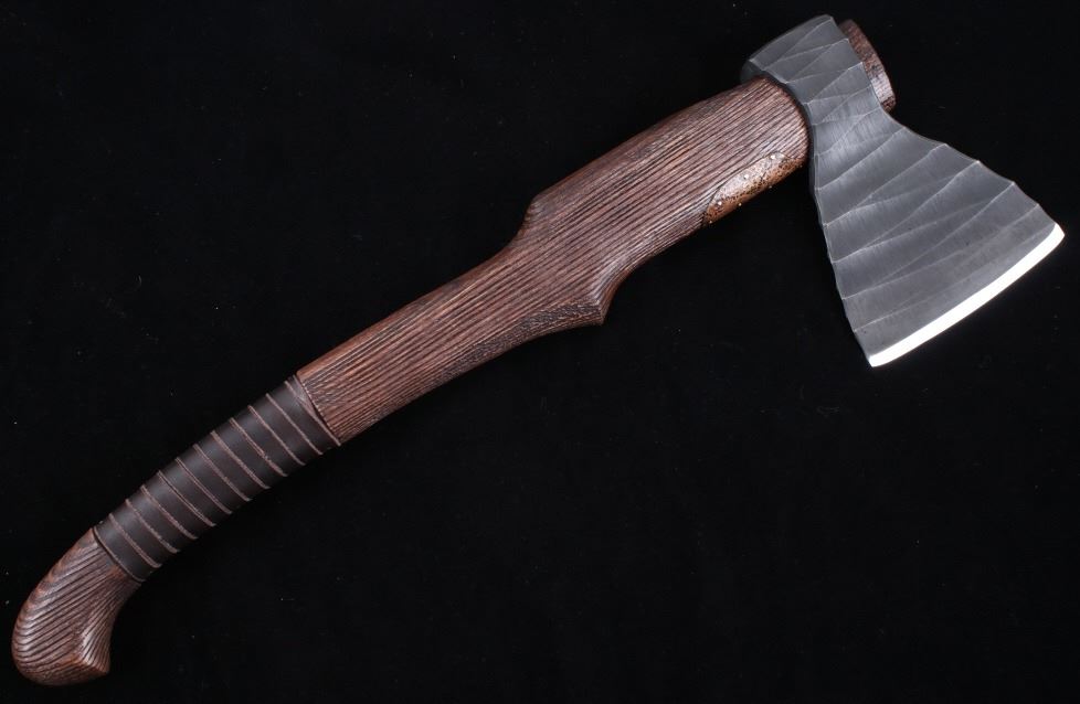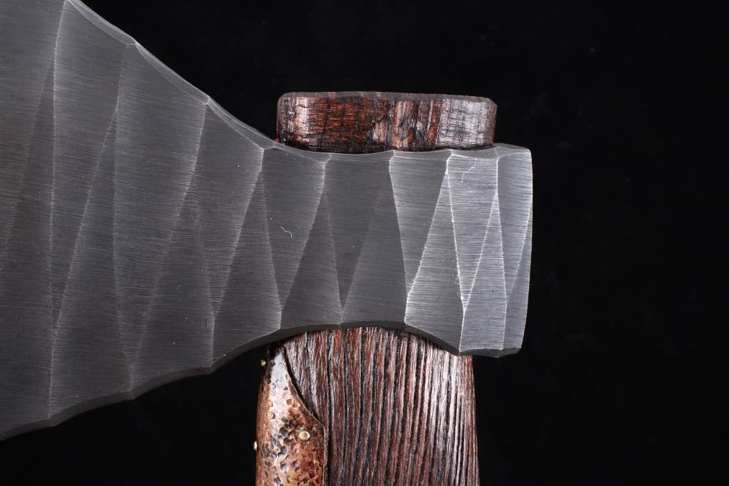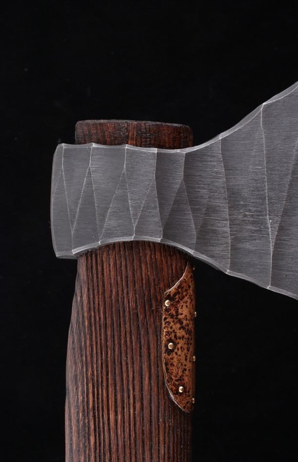 Featured in this lot is a forged high carbon Viking style battle axe made by Bjorn Ironside Forge located in Sweden. The forge is named after Bjorn Ironside, a Norse Viking chief and King of Sweden during the 9th century. King Bjorn Ironside was the son of legendary Viking king Ragnar Lothbrok and appears in Norse legends. This Viking style hand axe displays a wide axe head with machined grooves across the sides. The head is constructed from G10600 carbon steel and 52100 ball bearing steel. The left side of the blade is marked "Bjorn Ironside Forge Made In Sweden". The oak haft of the axe features a dark brown exterior with a decorative copper plate in the front. The piece shows a slightly curved handle with a leather wrapped grip. The axe displays wonderful condition and an excellent design. The piece comes with a custom leather cover. The axe measures 20 3/4" long overall, with the head measuring 6 1/2" long with a 4 3/4" cutting edge.
