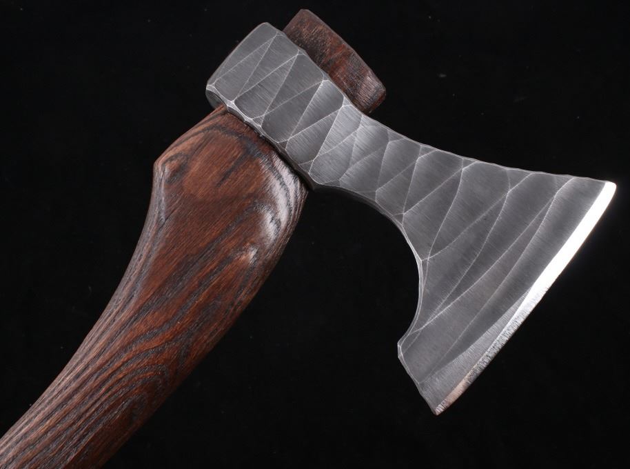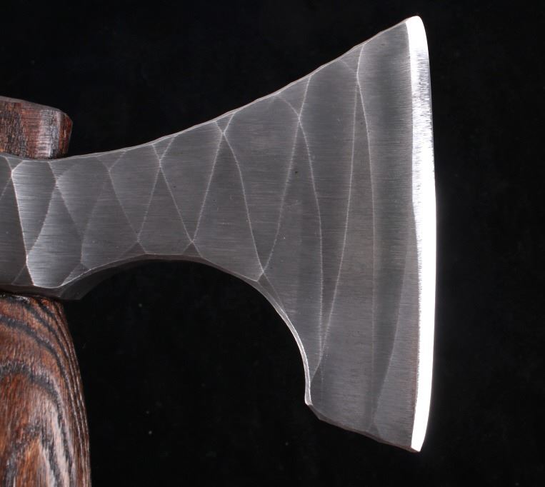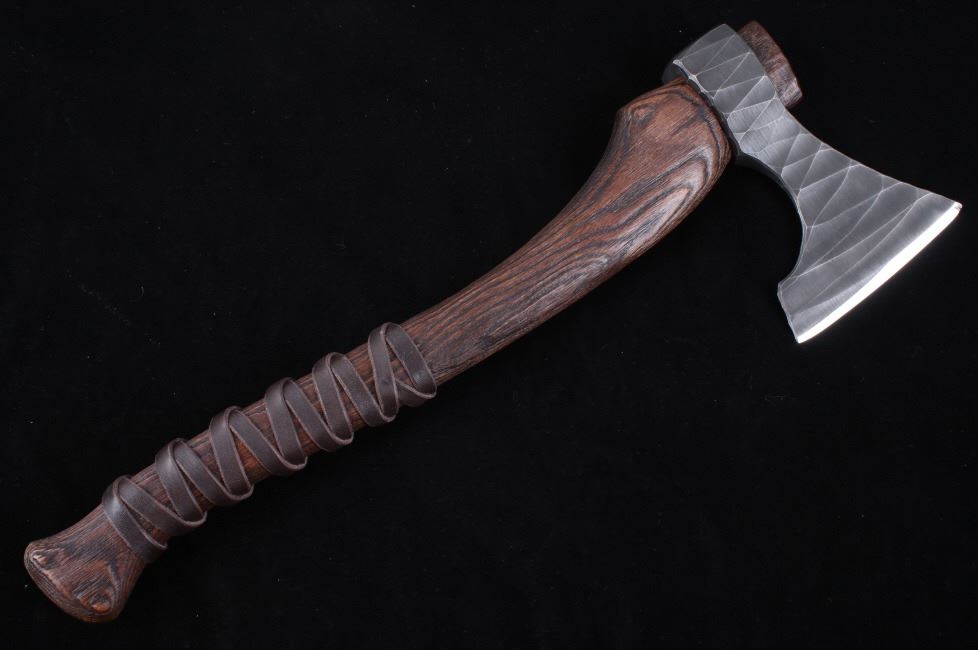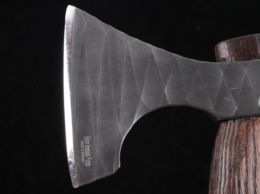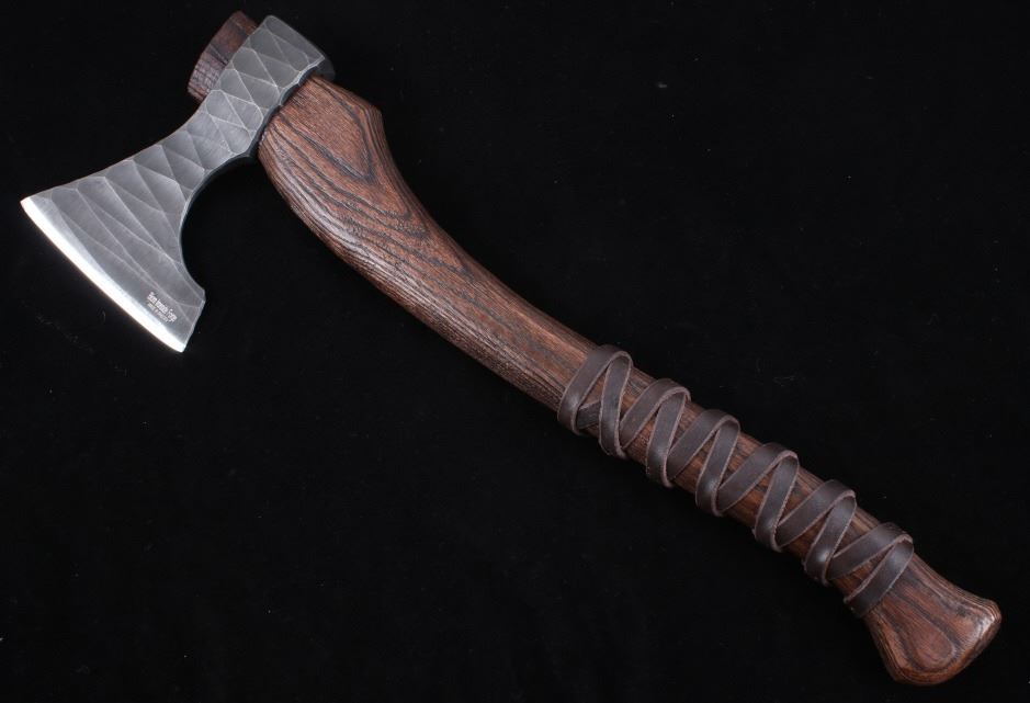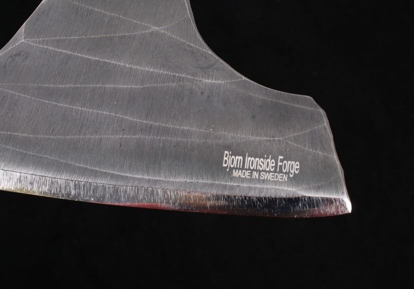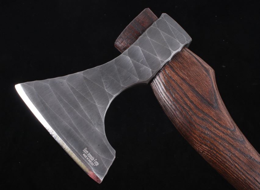 Featured in this lot is a forged high carbon Viking style bearded battle axe made by Bjorn Ironside Forge in Sweden. The forge is named after Bjorn Ironside, a Norse Viking chief and King of Sweden during the 9th century. King Bjorn Ironside is the son of legendary Viking king Ragnar Lothbrok and appears in Norse legends. This Viking style bearded axe displays a bearded axe head with machined grooves across the side. The head is constructed from G10600 carbon steel and 52100 ball bearing steel. The left side of the blade is marked "Bjorn Ironside Forge Made In Sweden". The oak haft of the axe displays a wonderful dark brown exterior with a leather cross wrapped handle. The axe displays wonderful condition with an excellent design. The piece comes with a custom leather cover. The axe measures 20 1/4" long overall with the head measuring 6 1/2" long with a 4 3/4" cutting edge.