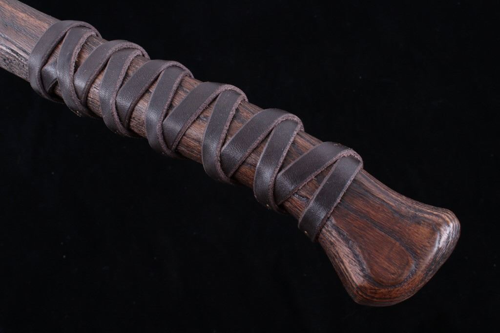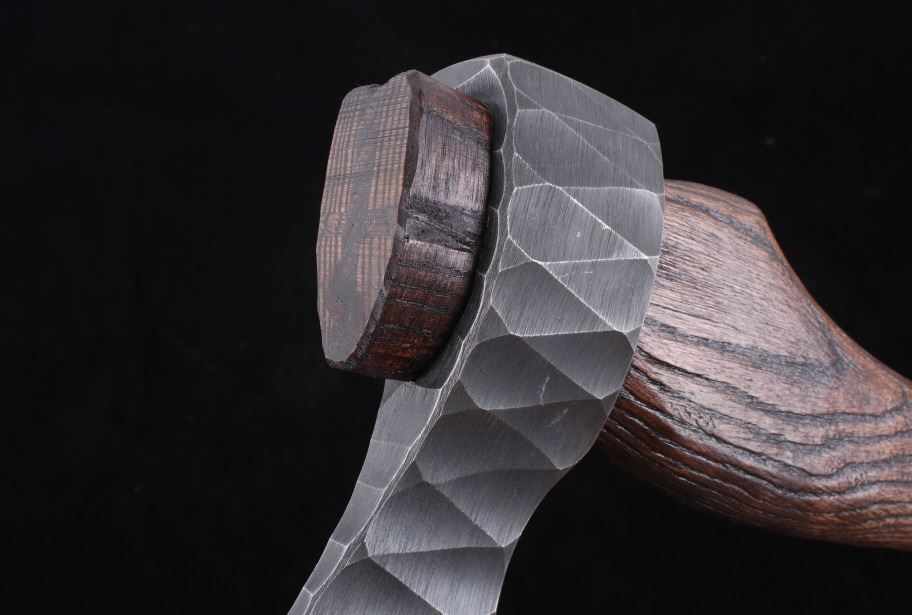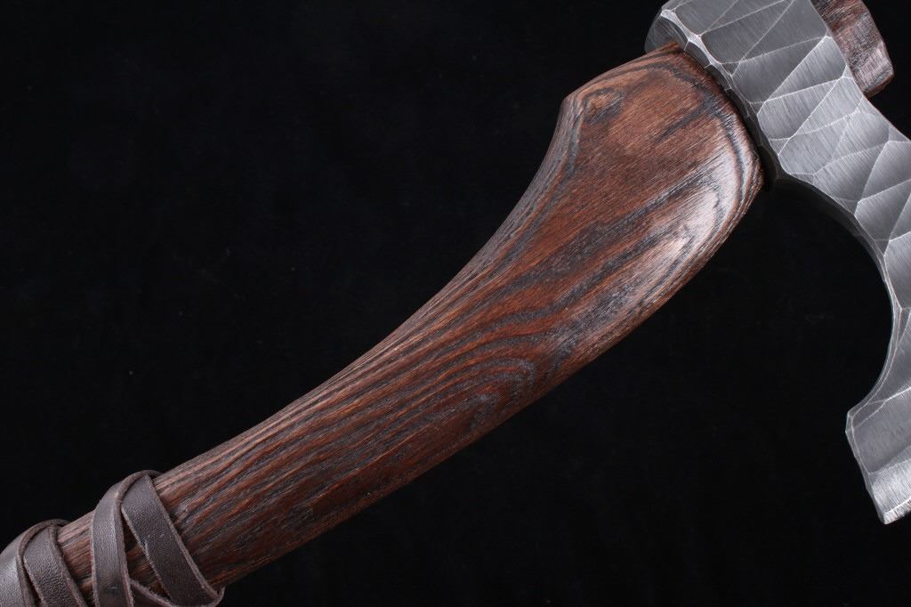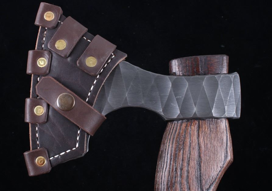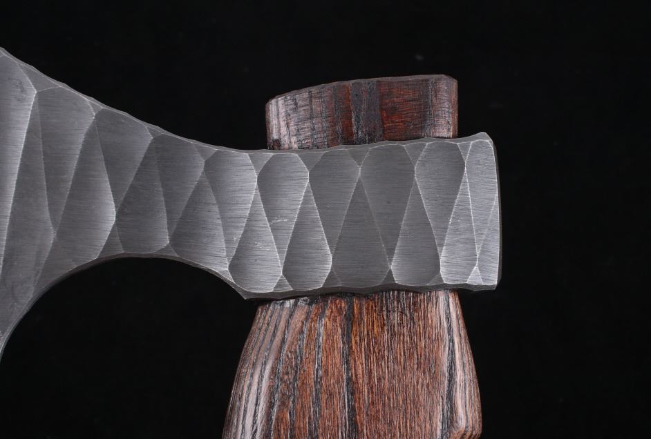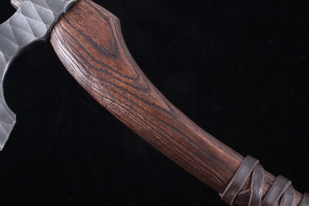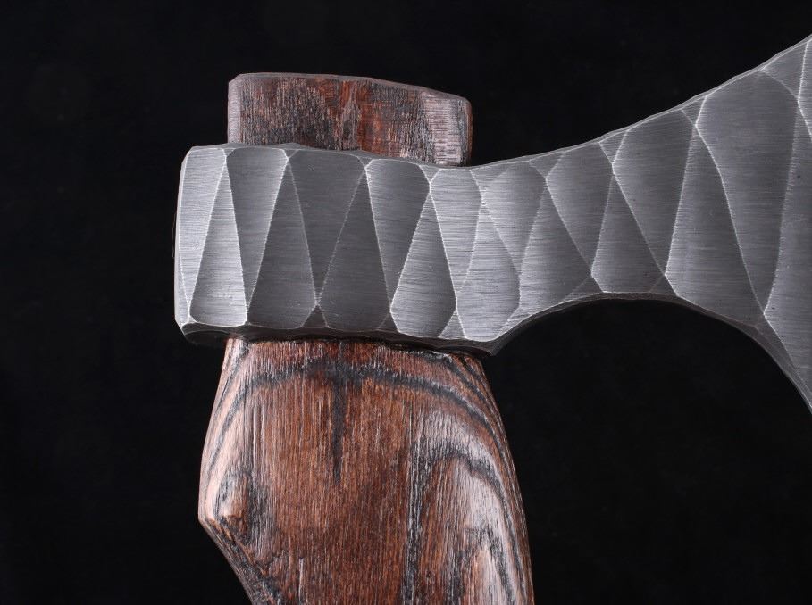 Featured in this lot is a forged high carbon Viking style bearded battle axe made by Bjorn Ironside Forge in Sweden. The forge is named after Bjorn Ironside, a Norse Viking chief and King of Sweden during the 9th century. King Bjorn Ironside is the son of legendary Viking king Ragnar Lothbrok and appears in Norse legends. This Viking style bearded axe displays a bearded axe head with machined grooves across the side. The head is constructed from G10600 carbon steel and 52100 ball bearing steel. The left side of the blade is marked "Bjorn Ironside Forge Made In Sweden". The oak haft of the axe displays a wonderful dark brown exterior with a leather cross wrapped handle. The axe displays wonderful condition with an excellent design. The piece comes with a custom leather cover. The axe measures 20 1/4" long overall with the head measuring 6 1/2" long with a 4 3/4" cutting edge.