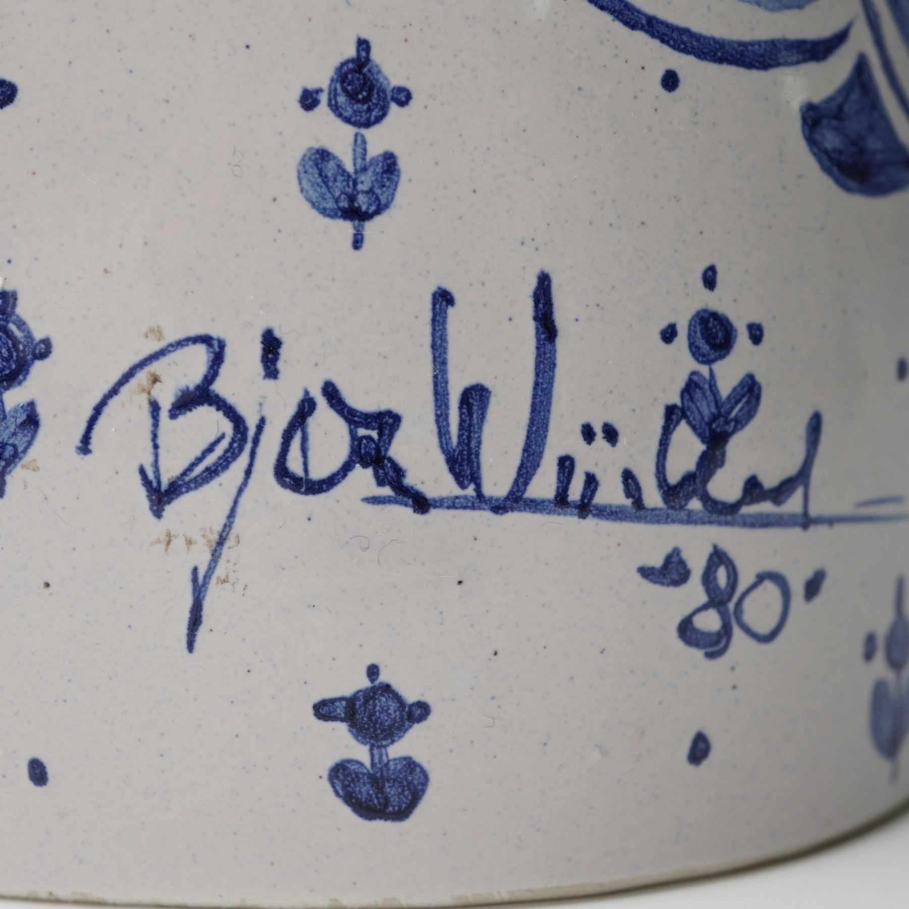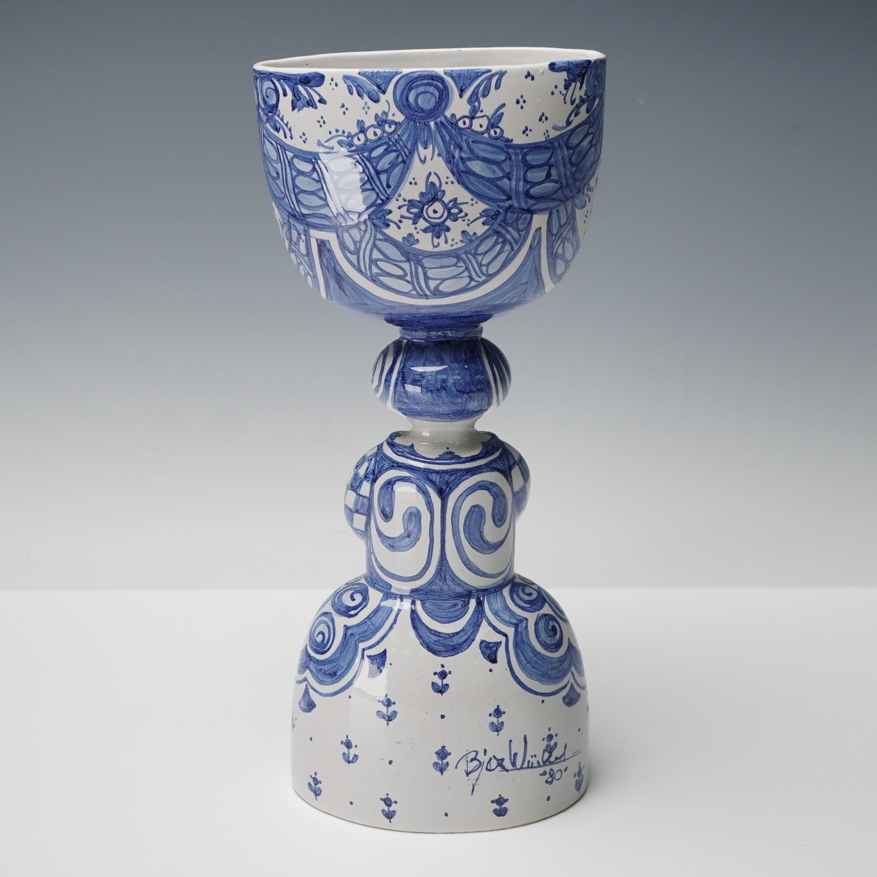 This ceramic figural vase features a stylized standing form supporting a bowl-shaped upper section decorated in blue and white painted motifs. The body shows patterned details and a figure holding flowers, characteristic of Bjorn Wiinblad's hand-painted work. The back is signed Bjorn Wiinblad with the date 80.