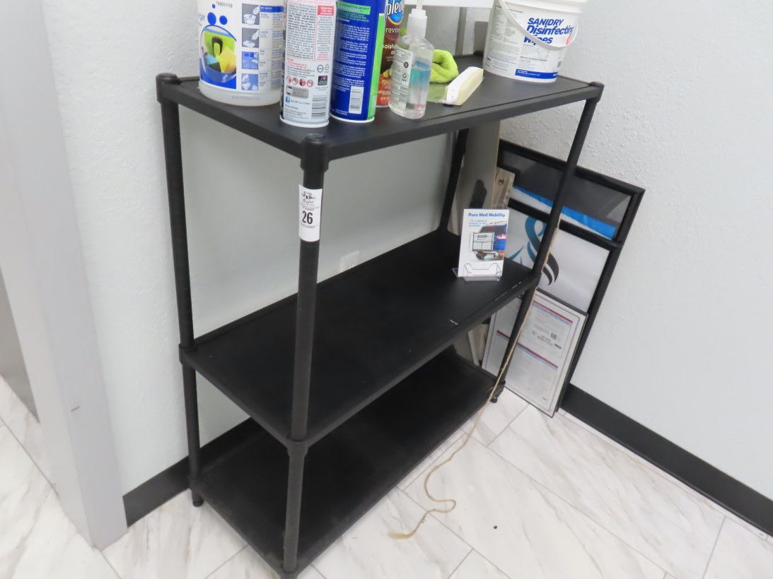 Black 3 Shelf Short Storage Rack w/Some Supplies and Safety Wall Boards