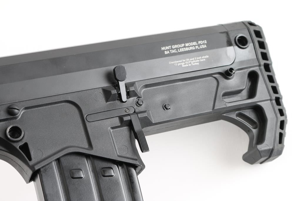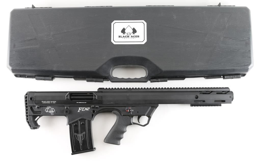 Manufactured in Turkey, imported by Black Aces Tactical. "Bull Pup" style Tactical shot chambered for 2 3/4", & 3" 12 Ga. shells. 18.5" barrel, Full choke insert,. vented handguard with integral accessory rails on top and bottom, manual safety, shell deflector attached, finger contoured grip, 5 rd magazine. 15" LOP. Comes in factory case, with extra magazine, manual, vertical fore grip, take-down tool, and two chokes, IC, and CYL. Bore is pristine, like new condition. NRA Condition-Perfect in Box. Modern Firearm.