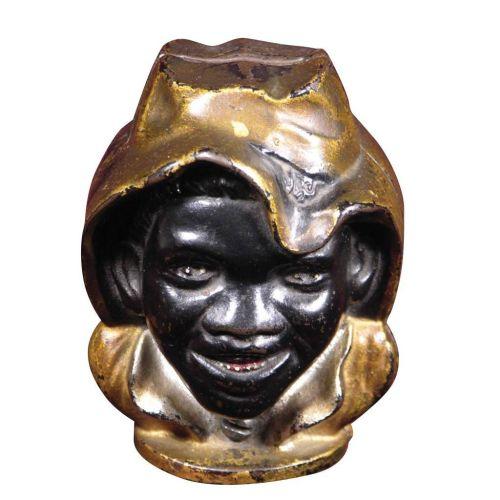Black Americana cast bank with image of young man. Excellent condition. 4 inches tall.