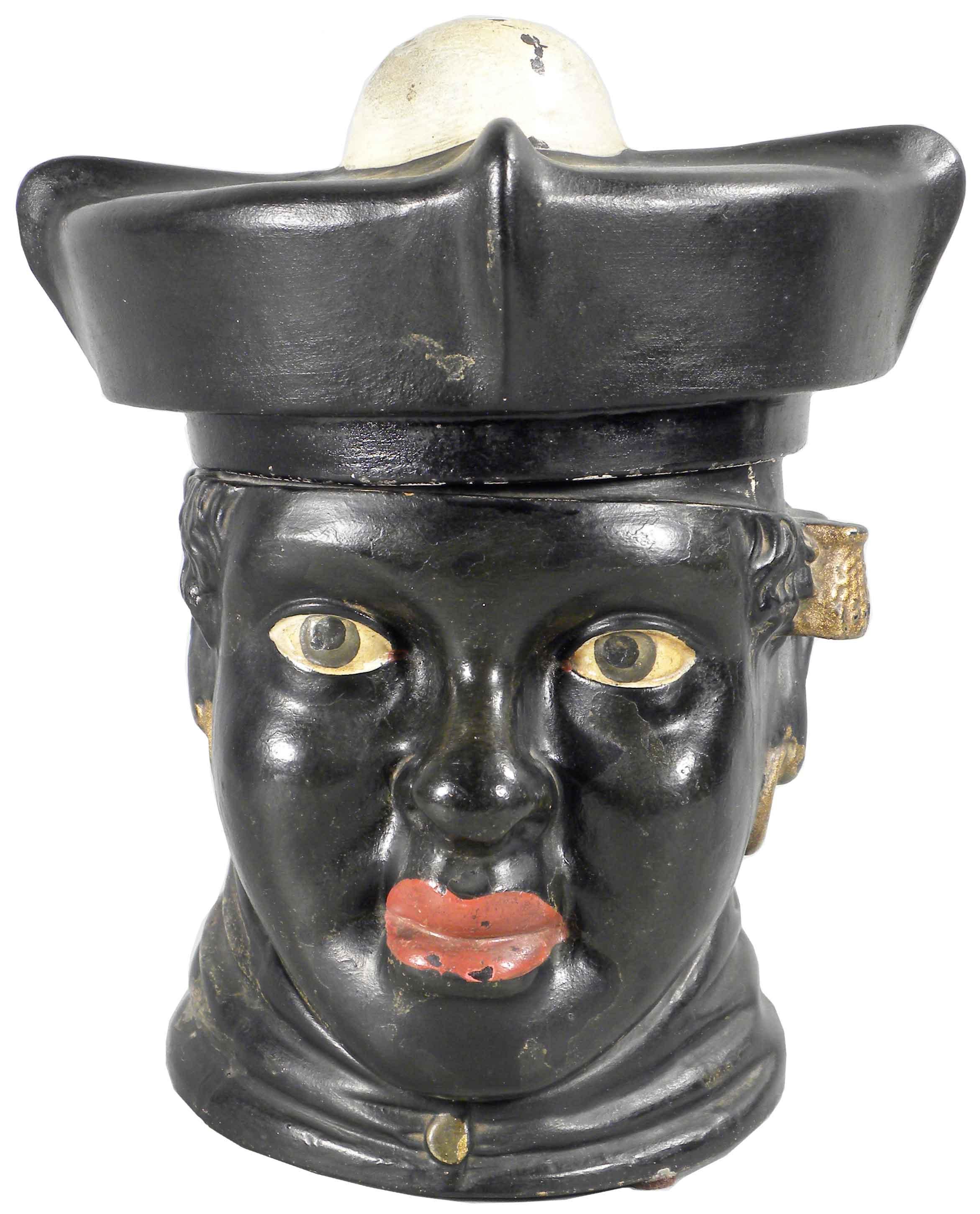 Black Americana Figural Porcelain Humidor. Man has gold earrings and bishop type hat. Minor chip on inside lid and early repaint otherwise very good condition. 8 inches tall.