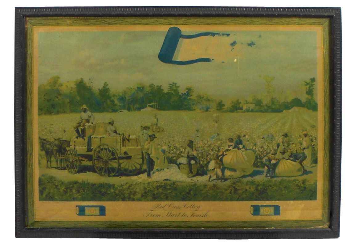Black Americana advertising print for Johnson & Johnson Red Cross Cotton, framed litho on cdbd showing Black workers picking cotton, c.1894 by Johnson & Johnson, VG cond w/minor foxing & edge wear, 24"H x 34"W.