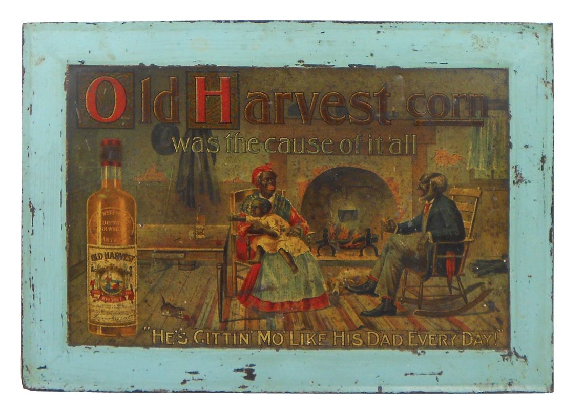 Black Americana sign, Old Harvest Whiskey litho on self-framed tin, wonderful graphics of Black fami