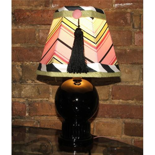 An antique lamp base and one of a kind custom shade with unique flair and style.</em></td>