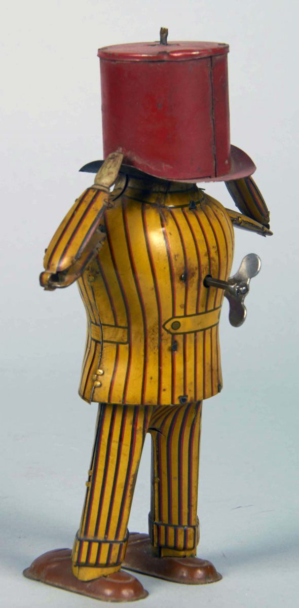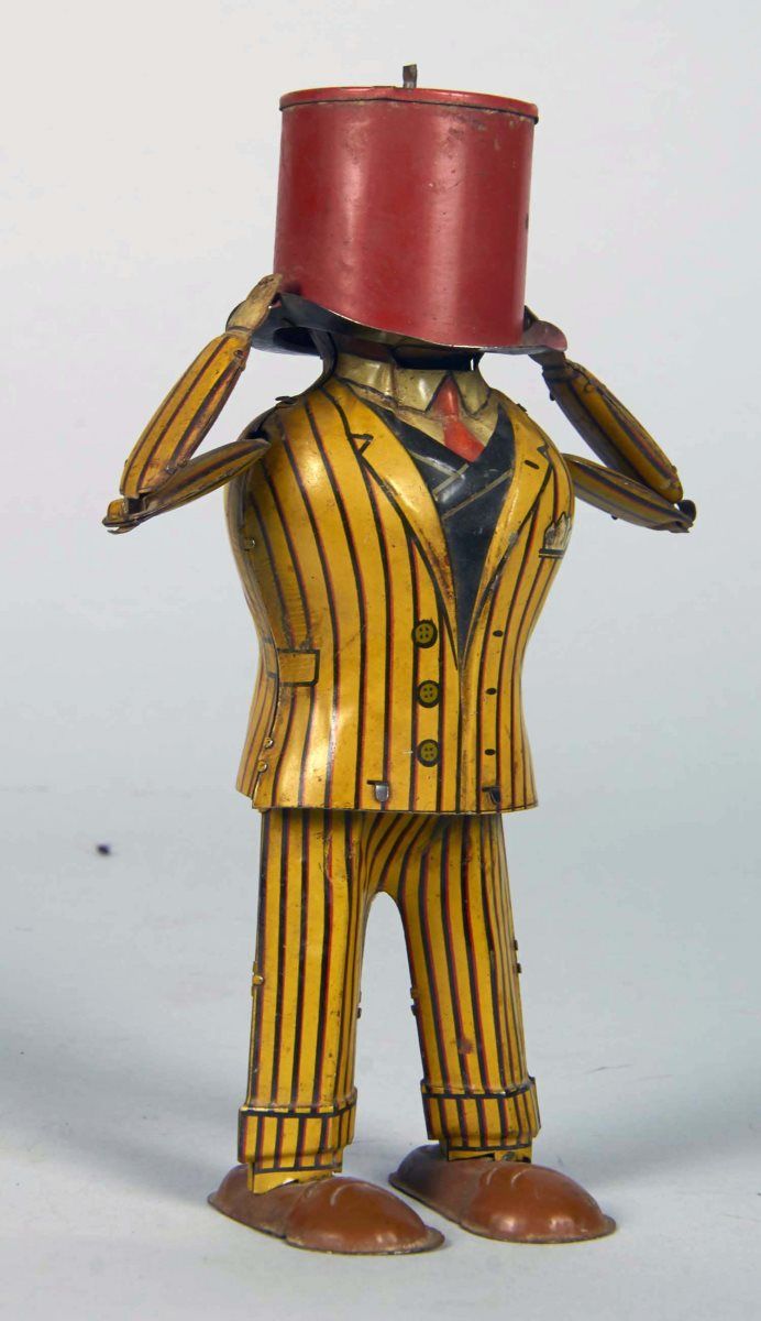 Clockwork wind-up litho toy raises his hat to show his race, lowers his hat to change his race from African American to Asian with a Fu Manchu mustache to Caucasian, No maker's mark, Works, c. 1930's Condition Good Size 10" tall