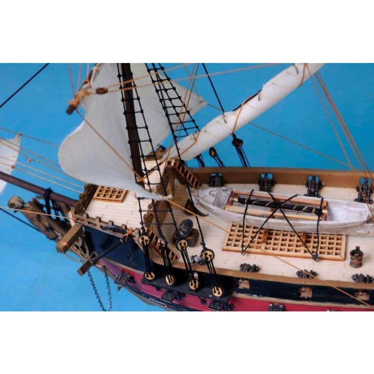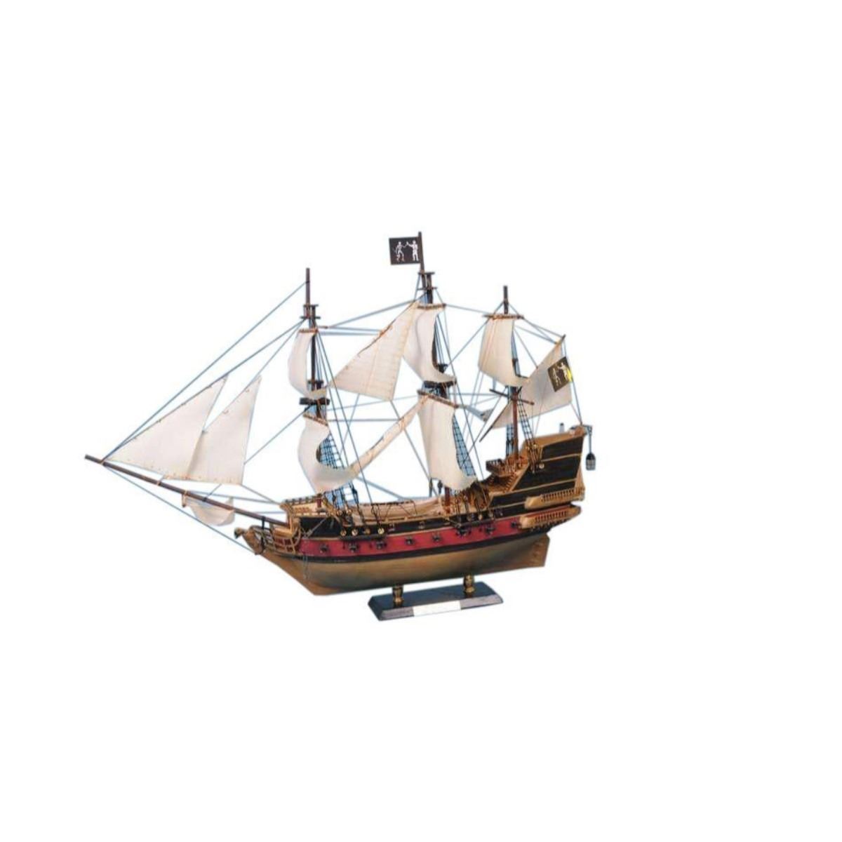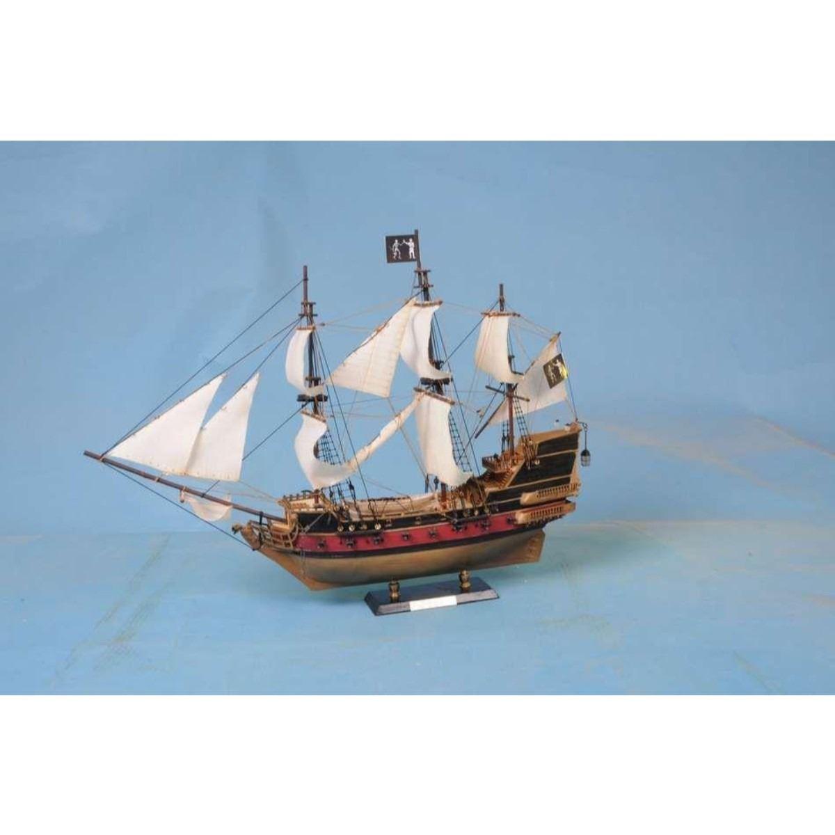 Board this exquisitely crafted tall ship model of Black Bart's Royal Fortune pirate ship and sail into high seas adventure. This model tall ship is a worthy flagship for the Commodore of a pirate fleet and will impress all who look upon her with her fine craftsmanship and unrelenting detail while filling you with the spirit of high seas adventure. Let this masterful Royal Fortune pirate tall model ship set her sails from a place of distinction in any home, office, or meeting room as you heave to and prepare to be boarded. Built from scratch over hundreds of hours by our master artisans High-quality woods include cherry, birch, maple, and rosewood Individual wooden planks used in hull construction Extensive rigging features over 100 blocks and deadeyes Cannon carriages tied-down to deck to reduce recoil Other Amazing Details, including: Planked deck with nail holes Authentic scale lifeboat with oars Rudder chains, metal anchors, cannonball racks Fine-crafted embellishments carved on stern below twin lanterns Additional deck details such as cannon balls, barrels, rope coils, and other nautical items 10 masterfully stitched, heavy white canvas sails Taut rigging with varied thread gauge and color