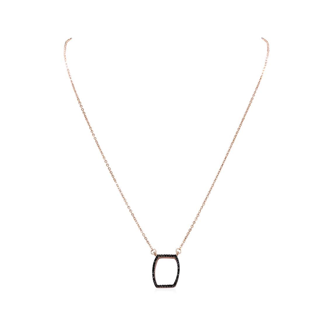 High end designer jewelry. Black CZ Pendant Necklace - Rose Gold Plated. Rose Gold Pltd- Slv925 Chain. Black/ Rose. 16/3inches. Total Weight: 2.4 grams.