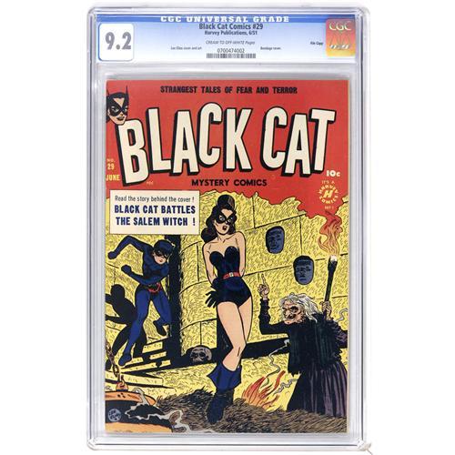 <B>Black Cat #29 File Copy (Harvey, 1951) CGC NM- 9.2 Cream to off-white pages.</B></I> Harvey Comics' curvaceous crimefighter finds herself about to be burned at the stake in this wild bondage cover scene, by artist Lee Elias. This sharp file copy should have the lucky winning bidder purring with delight! It's the last issue before the official name (and format) change to <B>Black Cat Mystery</B></I>. Overstreet 2006 NM- 9.2 value = $255. CGC census 5/06: 1 in 9.2, 1 higher. <BR><BR><B>Important notice:</B> Heritage usually auctions material at the rate of 200-250 lots per hour. On some occasions eBay Live bid software or the Internet may not be able to keep up with the pace of the auction. We recommend placing a realistic absentee bid now as insurance to avoid disappointment. Occasionally the auctioneer may eliminate or reject an eBay Live bid, and the auctioneer may also reopen a lot after the close of the eBay live bidding (usually because we missed an audience bid), and may reject your bid even if it shows you as the winning bidder. By bidding via eBay Live, you agree that Heritage may award the lot to another bidder at its sole discretion under the circumstances described above or any other reasonable circumstances. Since eBay bids are not shown to us until we open the lot on the floor, we treat those bids just like floor bids. In most cases the floor responds before the eBay bid is presented to us, due to Internet lag time, so for consistency we have made it a policy that floor bids are always considered first over tie eBay live bids. Also please note that all Heritage lots purchased through eBay Live carry a 22.5% Buyer's Premium. Please make sure you read the Terms and Conditions before you bid. This lot is being auctioned in conjunction with a live floor auction by Heritage Auction Galleries. All final auction and invoice information will be supplied by Heritage Auction Galleries, and all other information should be considered preliminary. Lot:41001 <BR><BR><B>Winning Notification and Billing:</B> After the FINAL session in this auction is complete, Heritage will send e-mail and snail mail invoices. This process normally takes several days. All final auction and invoice information will be supplied by Heritage Auction Galleries, and all other information should be considered preliminary. <BR><BR>This auction will be conducted on a live auction floor and over the Internet through eBay Live. If you choose to place an absentee bid, please take a moment to <font color='#0000ff'><u><a href='http://pages.ebay.com/liveauctions/help/before/laabsentee.html'>learn how eBay Live absentee bidding works</a></u></font><font color='#000000'>