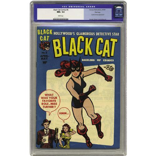 <B>Black Cat #5 File Copy (Harvey, 1947) CGC NM+ 9.6 White pages.</B></I> Team supreme Simon and Kirby contributed art to this issue, as did ace Bob Powell, who drew the Scarlet Arrow feature (we believe this to be that character's first appearance). This issue's cover gives you a look at both the Black Cat and her alter-ego, starlet Linda Turner. Overstreet 2006 NM- 9.2 value = $460. CGC census 3/06: 1 in 9.6, none higher.