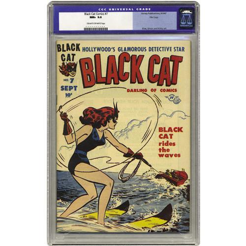 <B>Black Cat #7 File Copy (Harvey, 1947) CGC NM+ 9.6 Cream to off-white pages.</B></I> If you want Harveys from this era in top grades, file copies are pretty much your only shot, all the more so in the case of a white-cover book like this one. This issue has two stories by the Simon and Kirby team. Lee Elias added interior art as well as drawing the cover. Overstreet 2006 NM- 9.2 value = $460. CGC census 3/06: 1 in 9.6, none higher.
