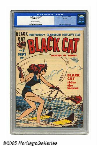 <B>Black Cat #7 File Copy (Harvey, 1947) CGC NM+ 9.6 Cream to off-white pages.</B></I> If you want Harveys from this era in top grades, file copies are pretty much your only shot, all the more so in the case of a white-cover book like this one. This issue has two stories by the Simon and Kirby team. Lee Elias added interior art as well as drawing the cover. Overstreet 2005 NM- 9.2 value = $440. CGC census 6/05: 1 in 9.6, none higher.