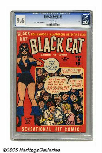<B>Black Cat #8 File Copy (Harvey, 1947) CGC NM+ 9.6 Off-white pages.</B></I> The Black Cat's adventures, drawn by Lee Elias, are supplemented here by a Vagabond Prince story with Simon and Kirby art, as well as the first of a series of reprints of the Kerry Drake newspaper strip. Overstreet 2005 NM- 9.2 value = $380. CGC census 6/05: 4 in 9.6, none higher.