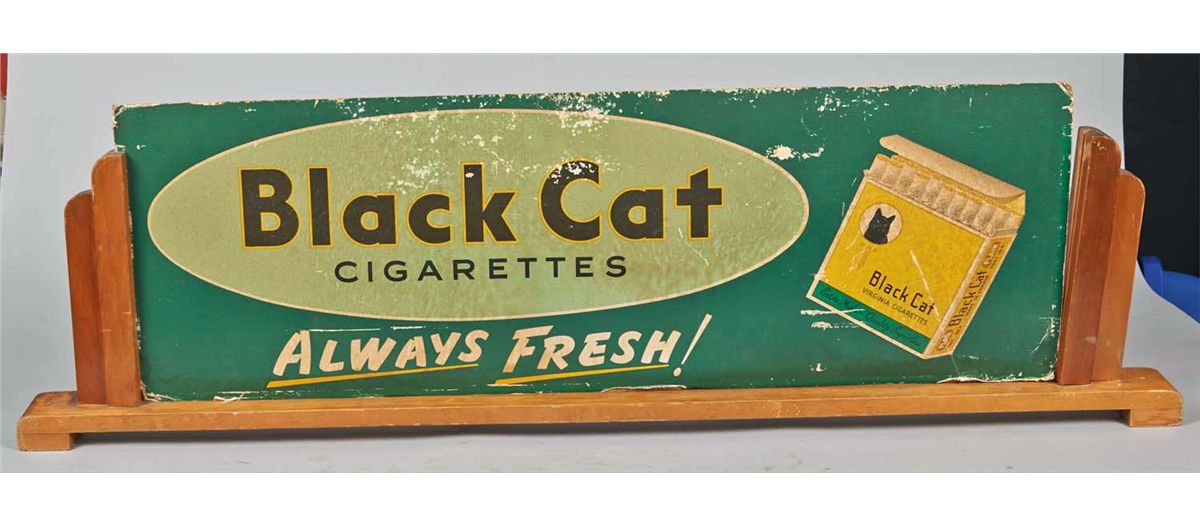 Sign In Deco Wood Frame Stand, "Always Fresh!" featuring cigarette pack, Some wear, Damage to back of sign Condition Good Size 45" x 13.5"