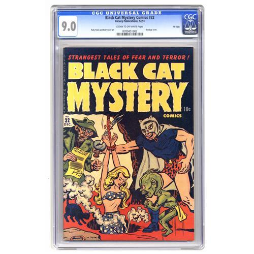 <B>Black Cat Mystery #32 File Copy (Harvey, 1951) CGC VF/NM 9.0 Cream to off-white pages.</B></I> Bondage cover. Rudy Palais and Bob Powell art. Overstreet 2006 VF/NM 9.0 value = $204; NM- 9.2 value = $270. CGC census 3/06: 4 in 9.0, 5 higher.