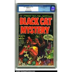 Black Cat Mystery #36 File Copy (Harvey, 1952). A creepy pre-code horror title with outstanding artwork by Bob Powell. This book looks virtually flawless; the cover still retains startling clarity and superb color. CGC VF/NM 9.0 Cream to light tan pages. Overstreet 2001 NM 9.4 value = $210. Important notice: We expect to be auctioning lots at the rate of 200-250 per hour. Sometimes eBay Premier live bid software cannot keep up with that pace, so we strongly recommend that you place a realistic proxy bid now as insurance to avoid disappointment. Also please note that all Heritage/CAA lots purchased through eBay Premier carry a 20% Buyer's Premium.