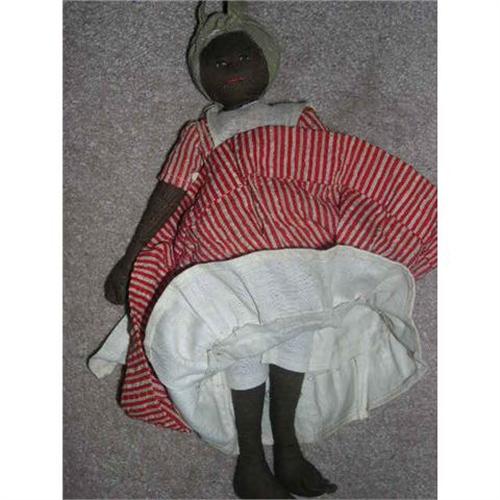 This is an 10 1/4" tall black cloth Mammy doll made in the 1930's. She has stitched features and is coton stuffed. She has her kerchief on her head and her pinafore apron. She is wearing a red and white striped seersucker dress. She has long arms with a separate thumb and stitched lines to indicate the fingers. Her feet have the stitched lines for the toes also. She has a cotton slip and pantaloons. She has no bad smells, rips or stains. She would be a great addition to your collection to represent a black doll from the 1930's. If you can love her, please consider her. She is from a smoke free environment.Buyer to pay $10 for U.S. shipping, insurance, and handling. Thanks for viewing.