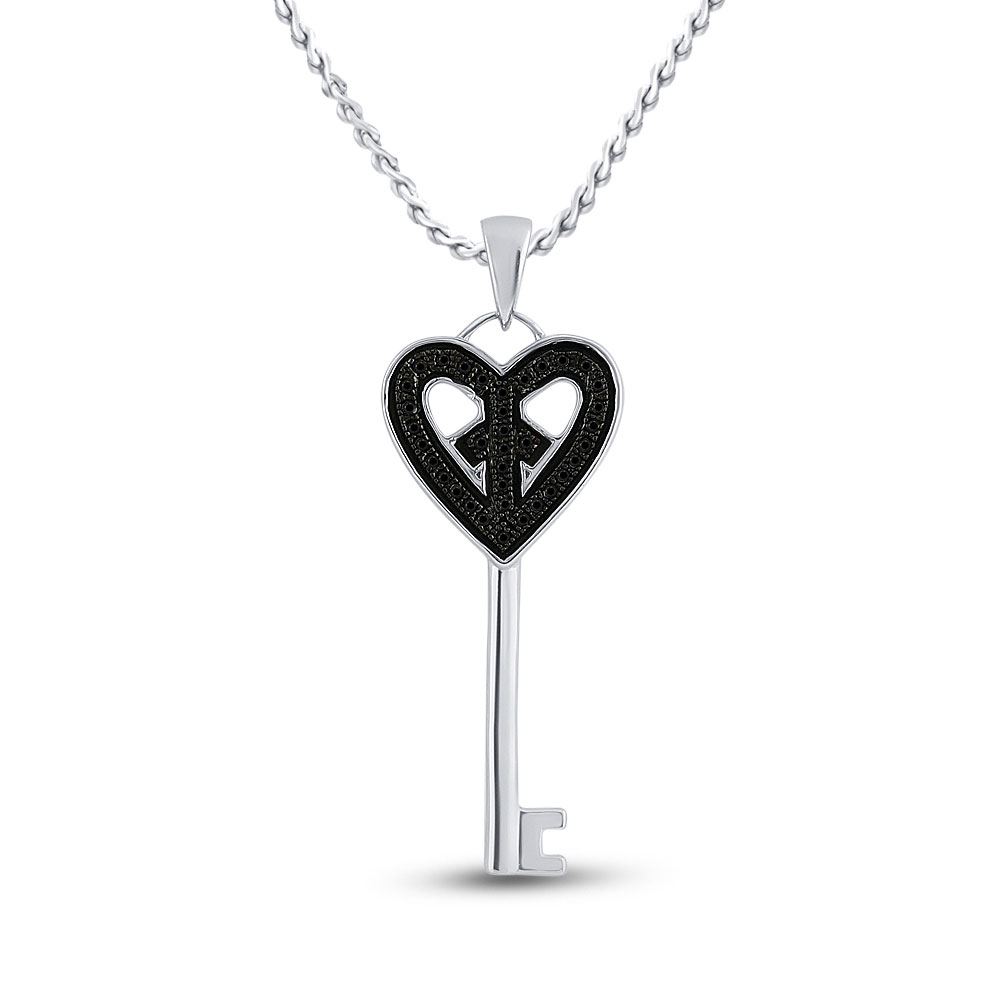 Sterling Silver Womens Round Black Color Enhanced Diamond Key Heart Pendant 1/10 Cttw