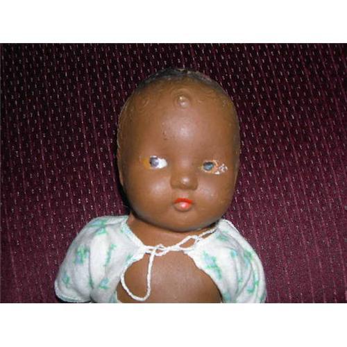 This is a 10" black composition baby. Theres is crazing and some lifting of paint. It's really a chocolate brown color. The arms and legs are strung on so they move. She is sold as is. She's from a smoke free environment. Buyer to pay $10 for shipping, insurance and handling. Thanks for viewing.