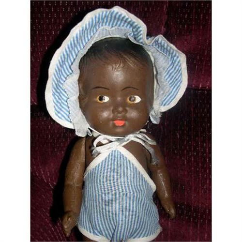 This is a great composition doll and she is painted black. She is all original. She has no cracks or crazing or repaint. There is one tiny spot on the side where the seam is that there is a spot where there was never any paint. She has strung on arms and legs and can move. She has molded socks and shoes. The socks are not painted but the shoe are painted pink. She has molded black painted hair. Her eyes are borwn. She has no finger chips, etc. I see one slight rub to one tiny spot on the back of her head. If you like black and composition, then you won't want to miss this one. The earlier black dolls are much harder to find than the white ones produced at the same time. Buyer to pay $15 for U.S. shipping, insurance, and handling. If you can love her,please bid. She is from a smoke free environment. Thanks for viewing.