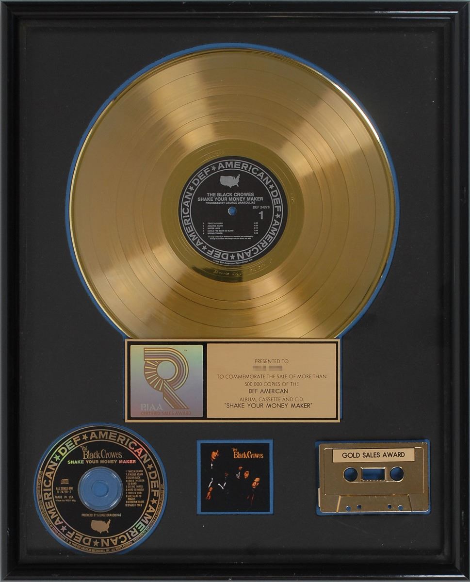Official ‘R’ hologram-style RIAA gold sales award presented “to commemorate the sale of more than 500,000 copies of the Def American album, cassette and C.D. ‘Shake Your Money Maker.’” Framed with its disc, plate, CD, cassette, and an image of the album cover to an overall size of 17 x 21. Award retains its original backing. In fine condition.