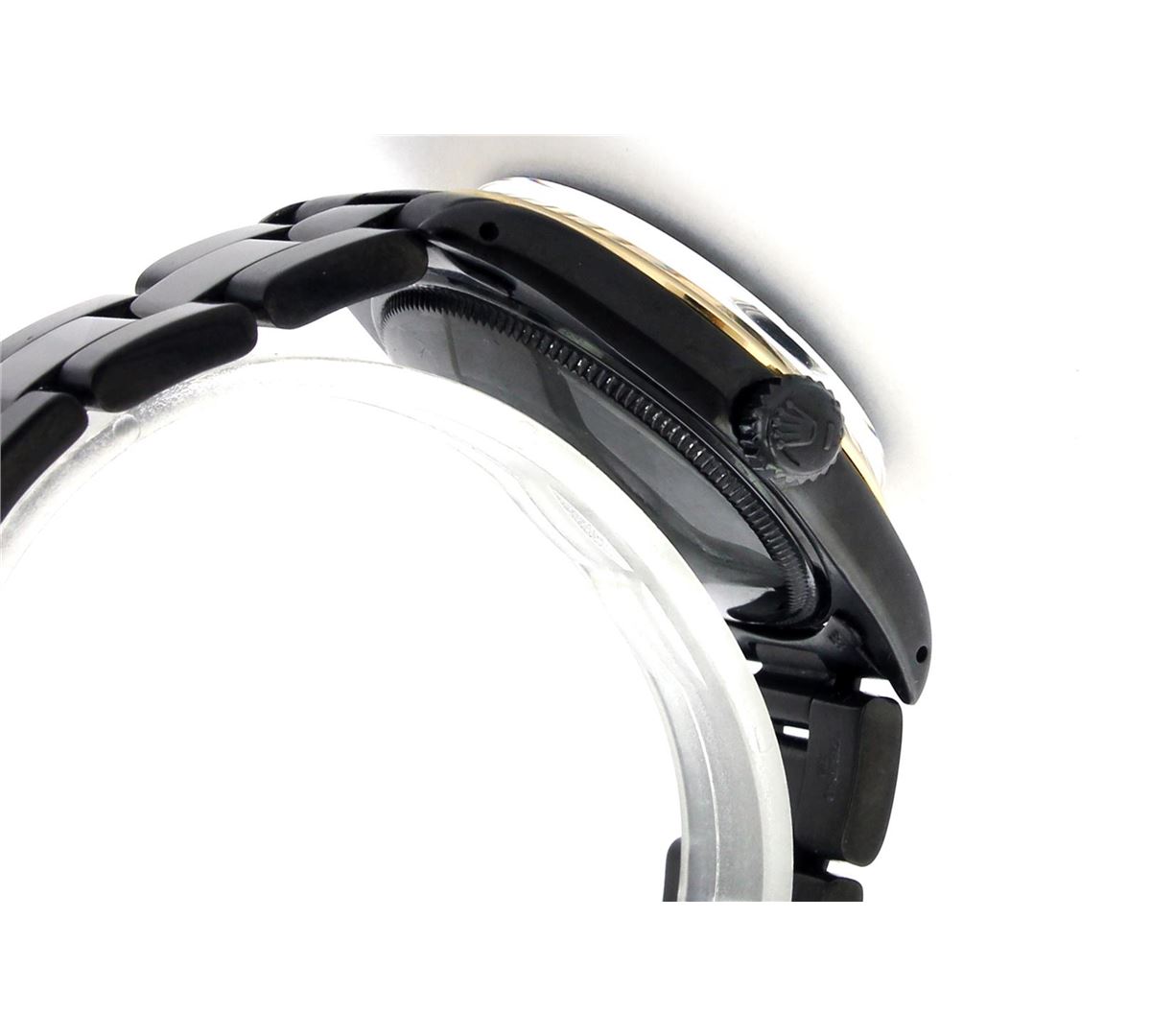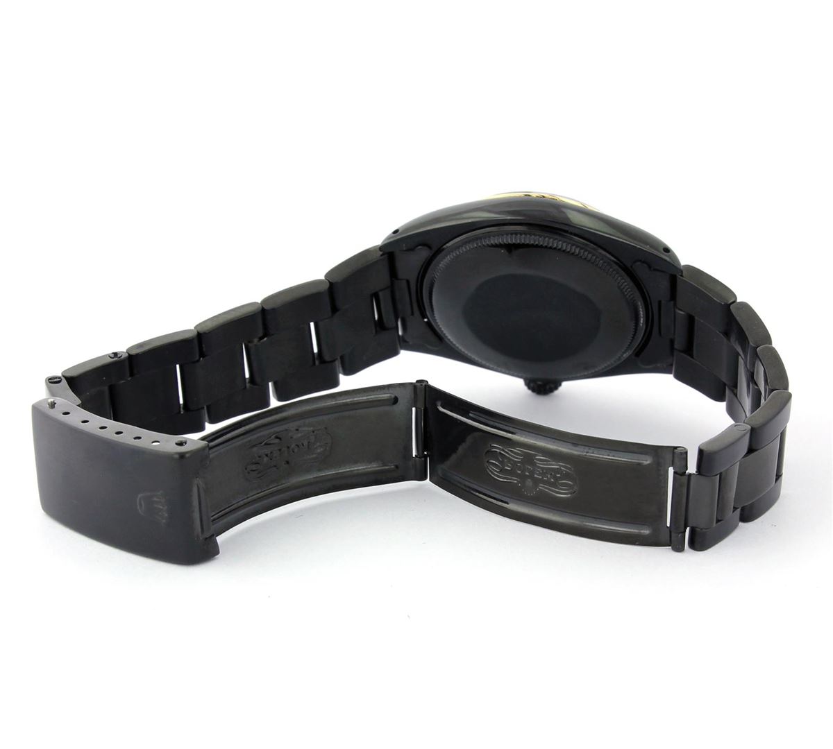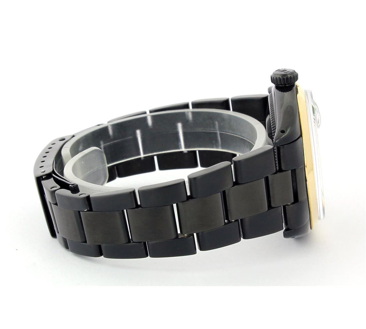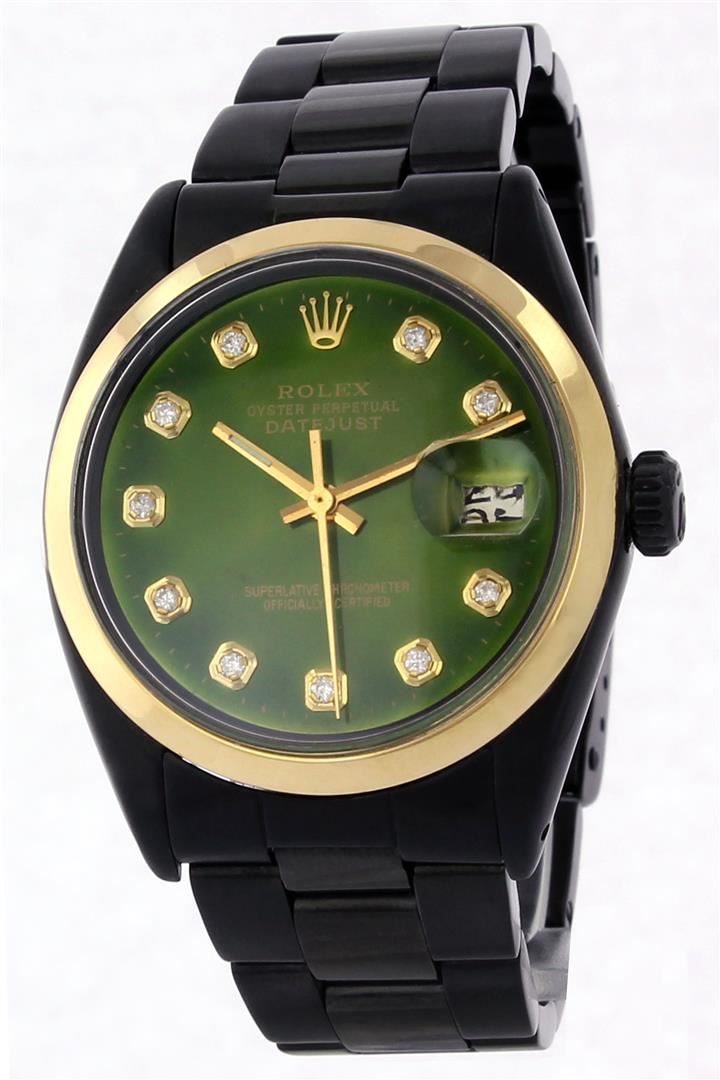 One Gents Rolex Datejust Polished, Serviced & Electronically Tested, PVD DLC Case:36mm, PVD DLC Crown, Bezel: 18K Yellow Gold Smooth Bezel Custom Crystal: Synthetic Sapphire Cyclops Lens. Movement: Automatic Winding Movement Caliber 1570. Dial: Green Dial Dial with Diamond Hour Markers, Diamond Count: 10 Diamonds, Color: G to H, Clarity: SI-VS. Date Window: 3 O'Clock Position Date Display, Nonquick, Model: 1500 Condition: G-6 Extra Fine. Band: Custom Brown Leather Band. 6.5 Inch Length, Adjustable. Custom Clasp.