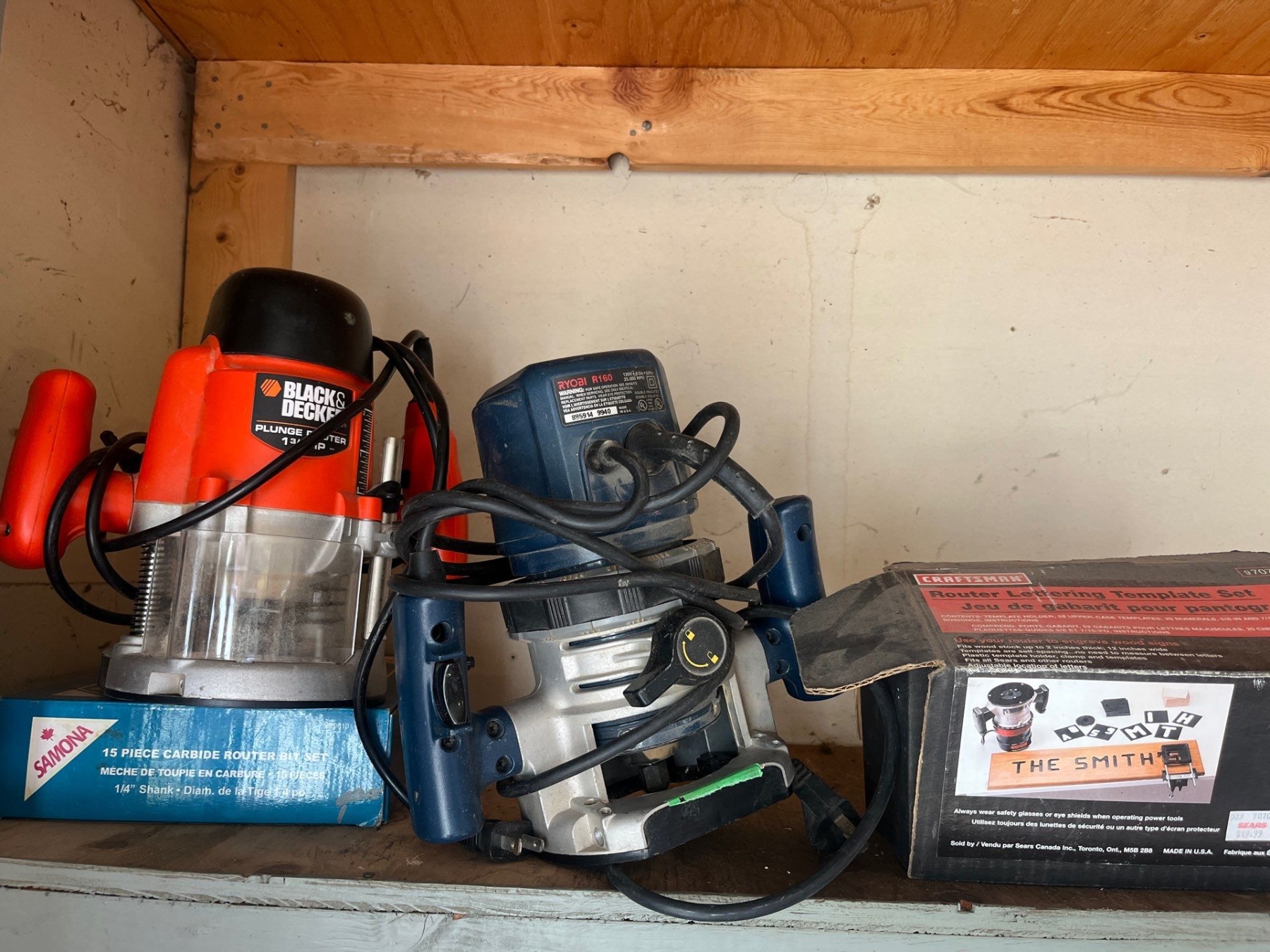 Black & Decker and Ryobi routers with a router tool kit to do names on boards