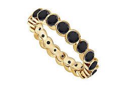 A never-ending circle of plush black diamonds makes a perfect symbol of an eternal love. Brilliant-cut round black diamonds are bezel-set in a 14K yellow gold mounting. This black diamond eternity band has a total diamond weight (TDW) of 1.00 ct.